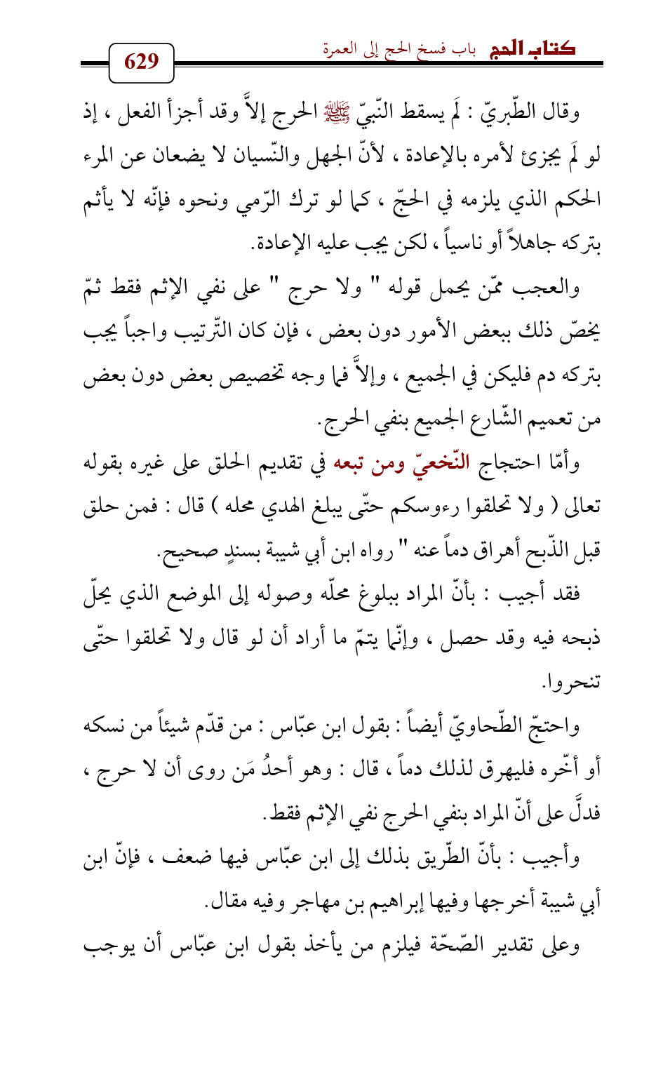 واحتجّ الطّحاويّ أيضاً: بقول ابن عبّاس: من قدّم شيئاً من نسكه أو أخّره فليهرق لذلك دماً، قال: وهو أحدُ مَن روى أن لا حرج، فدلَّ على أنّ المراد بنفي الحرج نفي الإثم فقط.