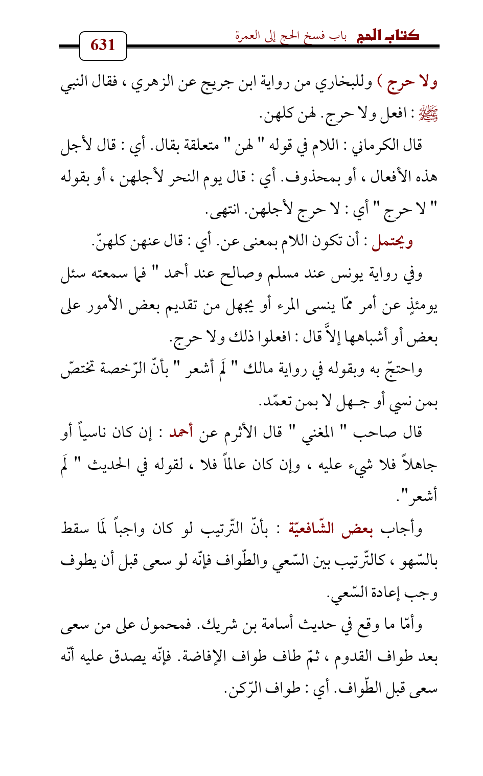 وأمّا ما وقع في حديث أسامة بن شريك. فمحمول على من سعى بعد طواف القدوم , ثمّ طاف طواف الإفاضة. فإنّه يصدق عليه أنّه سعى قبل الطّواف. أي: طواف الرّكن.