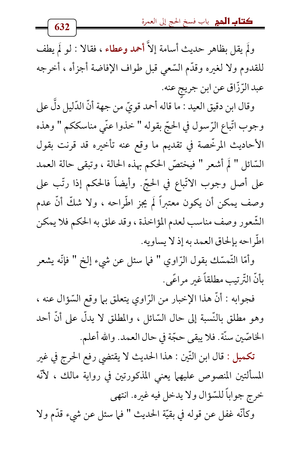 وقال ابن دقيق العيد: ما قاله أحمد قويّ من جهة أنّ الدّليل دلَّ على وجوب اتّباع الرّسول في الحجّ بقوله " خذوا عنّي مناسككم " وهذه الأحاديث المرخّصة في تقديم ما وقع عنه تأخيره قد قرنت بقول السّائل " لَم أشعر " فيختصّ الحكم بهذه الحالة , وتبقى حالة العمد على أصل وجوب الاتّباع في الحجّ. وأيضاً فالحكم إذا رتّب على وصف يمكن أن يكون معتبراً لَم يجز اطّراحه، ولا شكّ أنّ عدم الشّعور وصف مناسب لعدم المؤاخذة، وقد علق به الحكم فلا يمكن اطّراحه بإلحاق العمد به إذ لا يساويه.