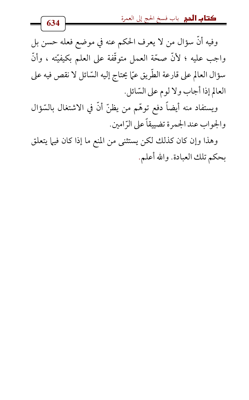وفيه أنّ سؤال من لا يعرف الحكم عنه في موضع فعله حسن بل واجب عليه؛ لأنّ صحّة العمل متوقّفة على العلم بكيفيّته، وأنّ سؤال العالم على قارعة الطّريق عمّا يحتاج إليه السّائل لا نقص فيه على العالم إذا أجاب ولا لوم على السّائل.