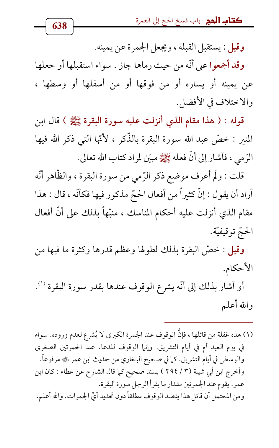 (¬1) هذه غفلة من قائلها , فإنَّ الوقوف عند الجمرة الكبرى لا يُشرع لعدم وروده. سواء في يوم العيد أم في أيام التشريق. وإنما الوقوف للدعاء عند الجمرتين الصغرى والوسطى في أيام التشريق. كما في صحيح البخاري من حديث ابن عمر - رضي الله عنه - مرفوعاً.