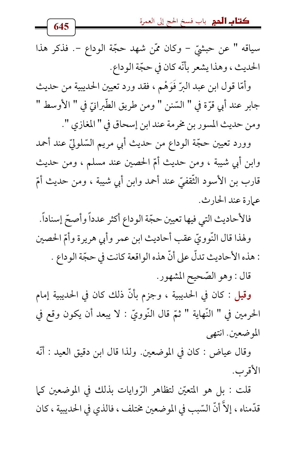 وقيل: كان في الحديبية، وجزم بأنّ ذلك كان في الحديبية إمام الحرمين في " النّهاية " ثمّ قال النّوويّ: لا يبعد أن يكون وقع في الموضعين. انتهى