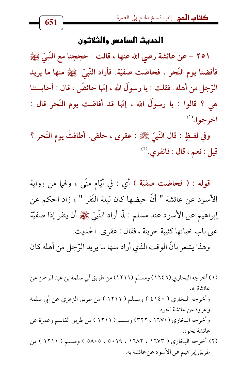 251 - عن عائشة رضي الله عنها , قالت: حججنا مع النّبيّ - صلى الله عليه وسلم - فأفضنا يوم النّحر , فحاضت صفيّة. فأراد النّبيّ - صلى الله عليه وسلم - منها ما يريد الرّجل من أهله. فقلت: يا رسولَ الله , إنّها حائضٌ , قال: أحابستنا هي؟ قالوا: يا رسولَ الله , إنّها قد أفاضت يوم النّحر قال: اخرجوا. (¬1)