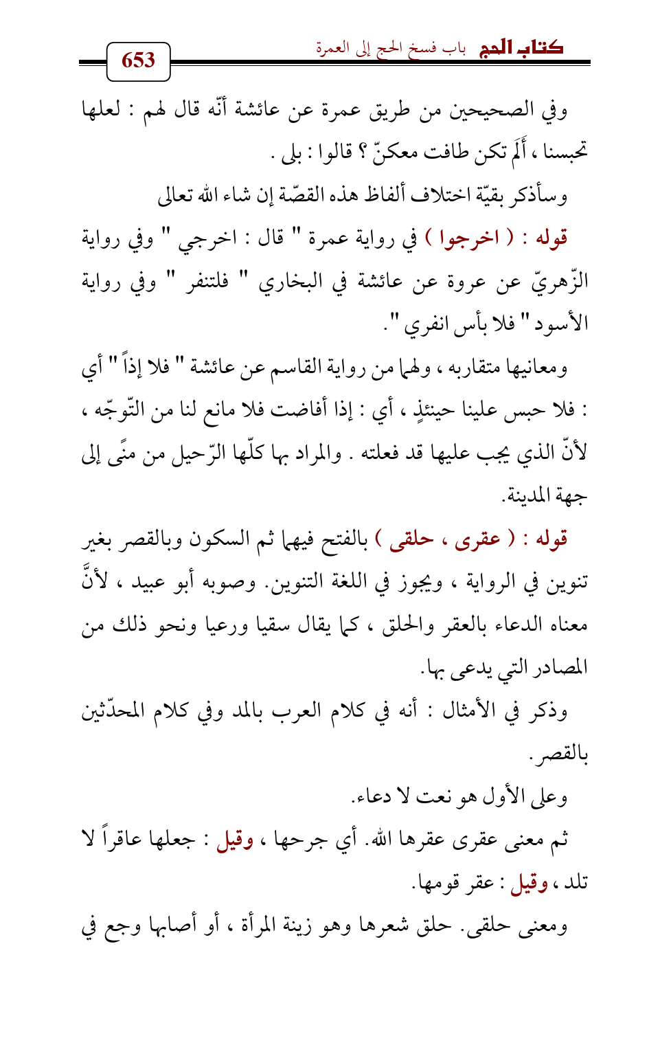 ومعانيها متقاربه , ولهما من رواية القاسم عن عائشة " فلا إذاً " أي: فلا حبس علينا حينئذٍ، أي: إذا أفاضت فلا مانع لنا من التّوجّه , لأنّ الذي يجب عليها قد فعلته. والمراد بها كلّها الرّحيل من منًى إلى جهة المدينة.