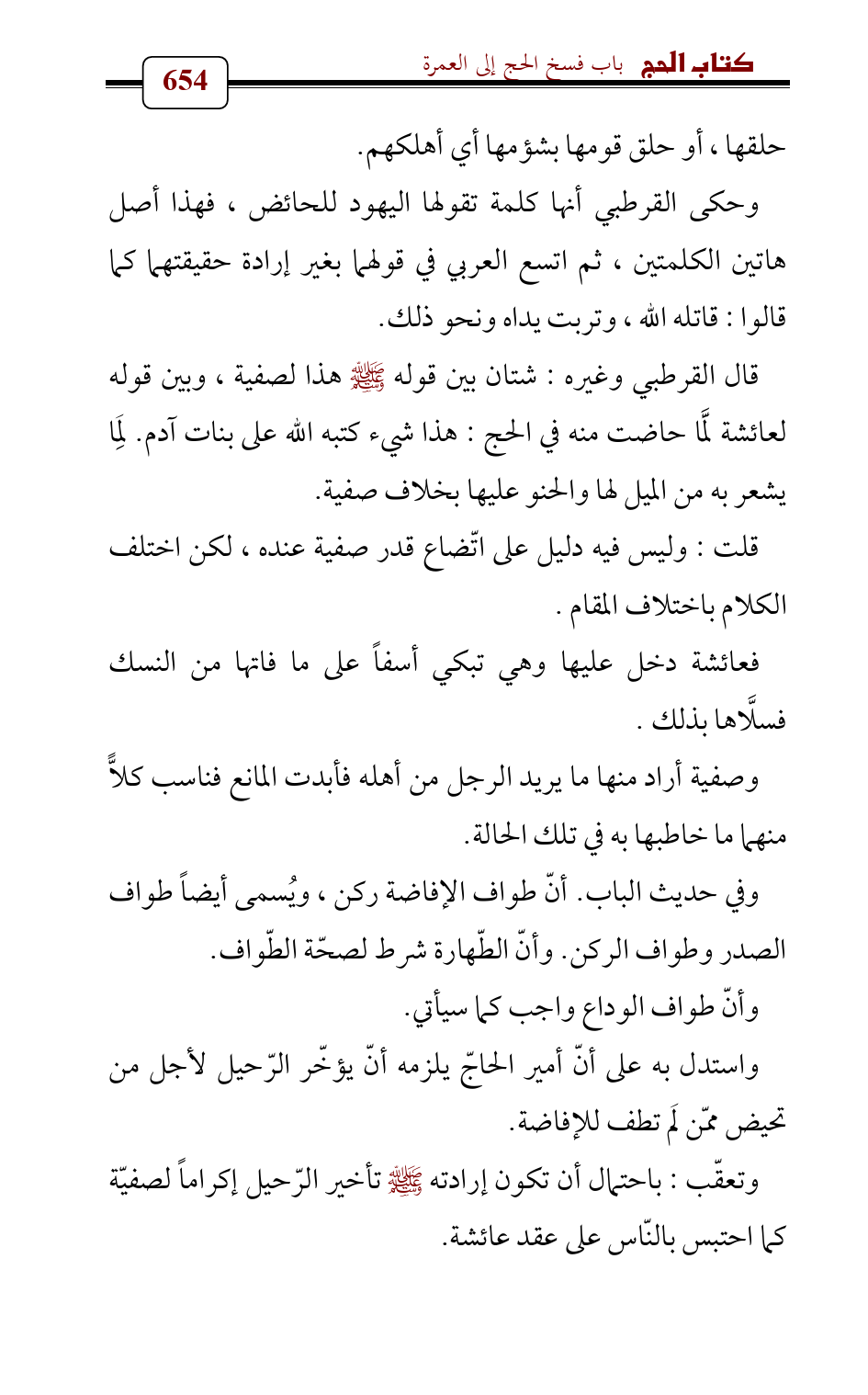 قال القرطبي وغيره: شتان بين قوله - صلى الله عليه وسلم - هذا لصفية , وبين قوله لعائشة لَمَّا حاضت منه في الحج: هذا شيء كتبه الله على بنات آدم. لِمَا يشعر به من الميل لها والحنو عليها بخلاف صفية.