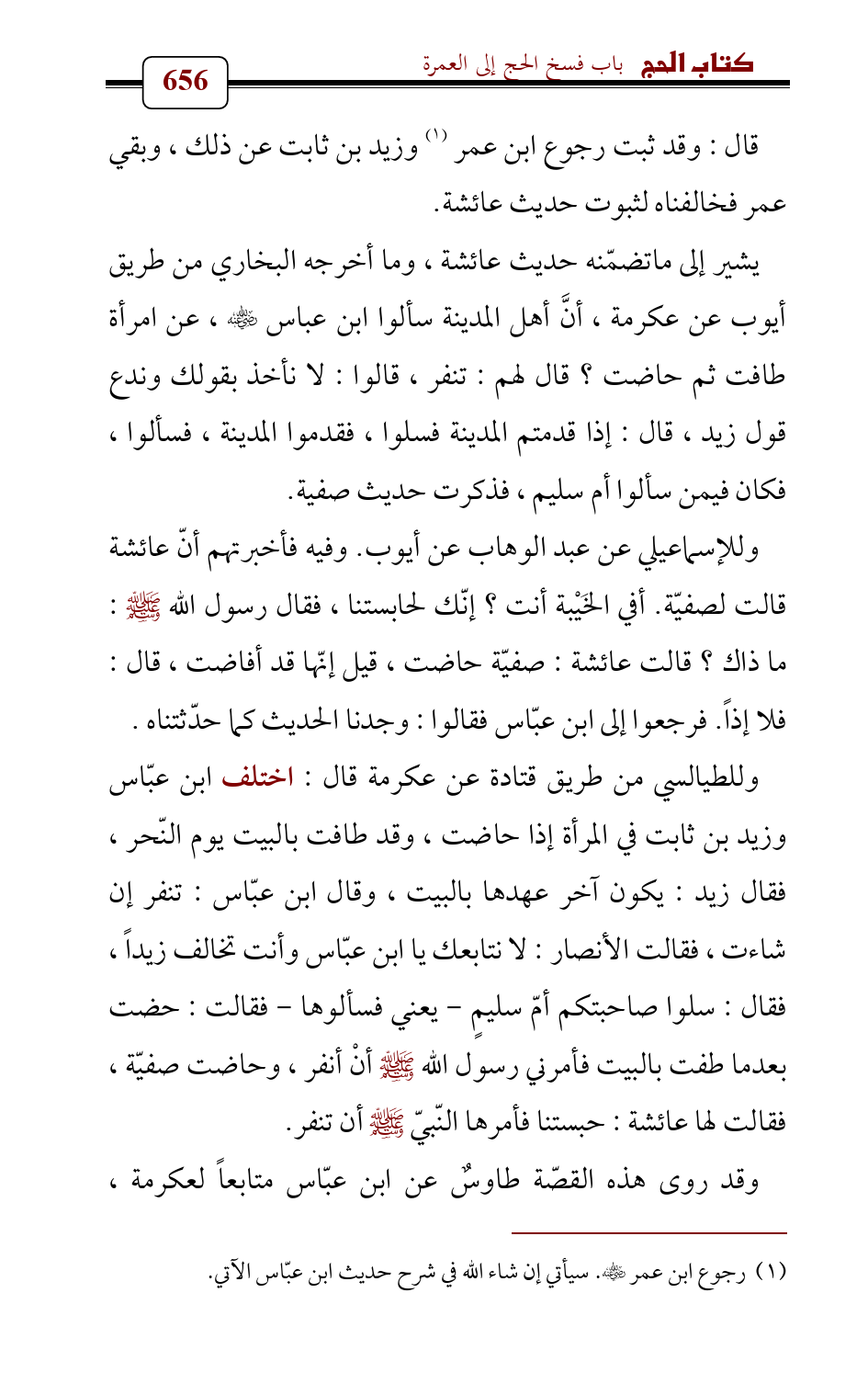 وللطيالسي من طريق قتادة عن عكرمة قال: اختلف ابن عبّاس وزيد بن ثابت في المرأة إذا حاضت , وقد طافت بالبيت يوم النّحر، فقال زيد: يكون آخر عهدها بالبيت، وقال ابن عبّاس: تنفر إن شاءت، فقالت الأنصار: لا نتابعك يا ابن عبّاس وأنت تخالف زيداً، فقال: سلوا صاحبتكم أمّ سليمٍ - يعني فسألوها - فقالت: حضت بعدما طفت بالبيت فأمرني رسول الله - صلى الله عليه وسلم - أنْ أنفر، وحاضت صفيّة , فقالت لها عائشة: حبستنا فأمرها النّبيّ - صلى الله عليه وسلم - أن تنفر.