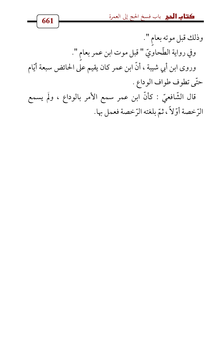 قال الشّافعيّ: كأنّ ابن عمر سمع الأمر بالوداع , ولَم يسمع الرّخصة أوّلاً , ثمّ بلغته الرّخصة فعمل بها.
