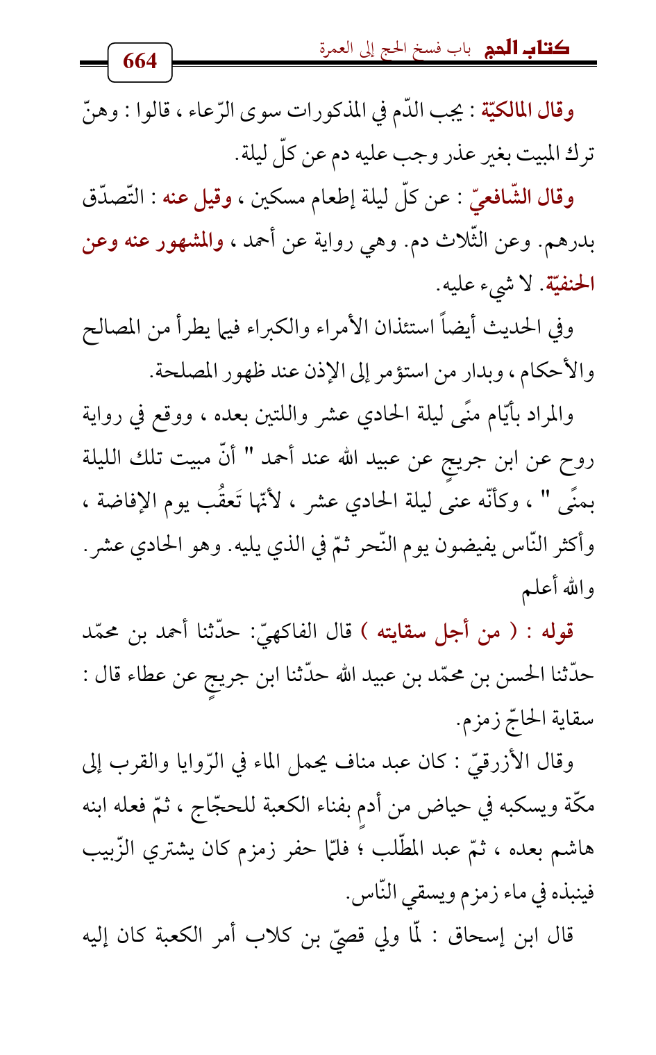 قوله: (من أجل سقايته) قال الفاكهيّ: حدّثنا أحمد بن محمّد حدّثنا الحسن بن محمّد بن عبيد الله حدّثنا ابن جريجٍ عن عطاء قال: سقاية الحاجّ زمزم.