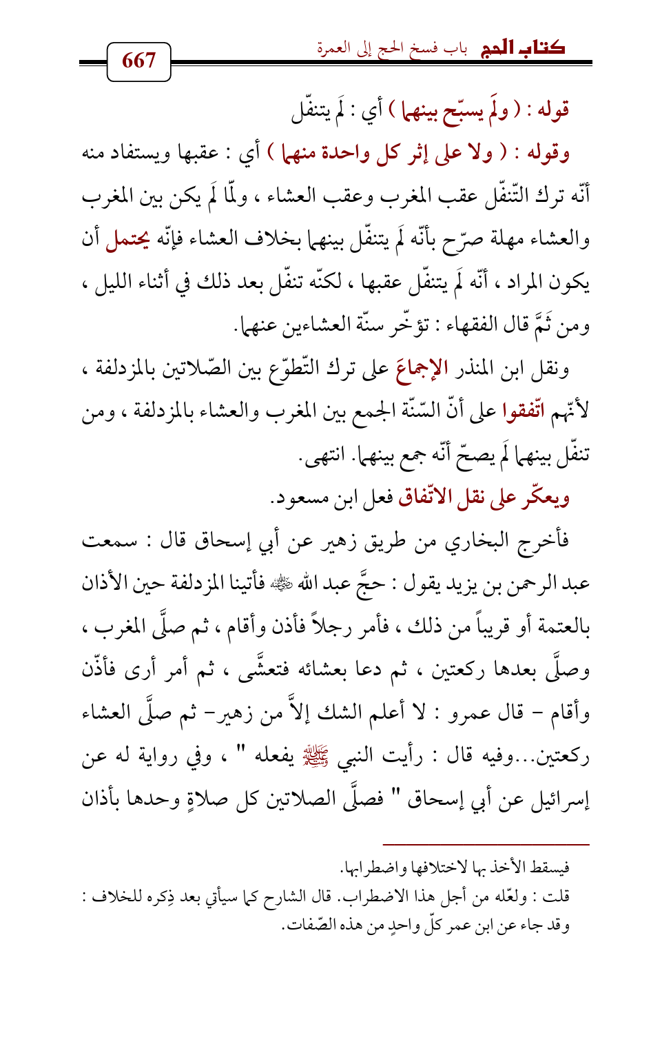 فأخرج البخاري من طريق زهير عن أبي إسحاق قال: سمعت عبد الرحمن بن يزيد يقول: حجَّ عبد الله - رضي الله عنه - فأتينا المزدلفة حين الأذان بالعتمة أو قريباً من ذلك، فأمر رجلاً فأذن وأقام، ثم صلَّى المغرب، وصلَّى بعدها ركعتين، ثم دعا بعشائه فتعشَّى، ثم أمر أرى فأذّن وأقام - قال عمرو: لا أعلم الشك إلاَّ من زهير- ثم صلَّى العشاء ركعتين ... وفيه قال: رأيت النبي - صلى الله عليه وسلم - يفعله " , وفي رواية له عن إسرائيل عن أبي إسحاق " فصلَّى الصلاتين كل صلاةٍ وحدها بأذان
