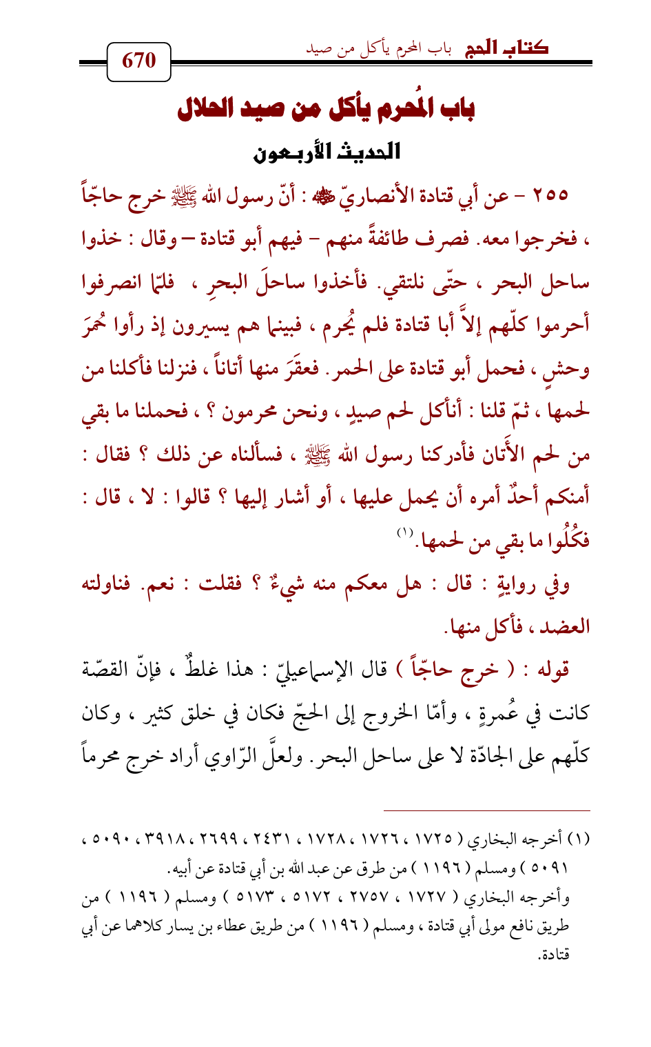 255 - عن أبي قتادة الأنصاريّ - رضي الله عنه -: أنّ رسول الله - صلى الله عليه وسلم - خرج حاجّاً , فخرجوا معه. فصرف طائفةً منهم - فيهم أبو قتادة - وقال: خذوا ساحل البحر , حتّى نلتقي. فأخذوا ساحلَ البحرِ , فلمّا انصرفوا أحرموا كلّهم إلاَّ أبا قتادة فلم يُحرم , فبينما هم يسيرون إذ رأوا حُمرَ وحشٍ , فحمل أبو قتادة على الحمر. فعقَرَ منها أتاناً , فنزلنا فأكلنا من لحمها , ثمّ قلنا: أنأكل لحم صيدٍ , ونحن محرمون؟ , فحملنا ما بقي من لحم الأَتان فأدركنا رسول الله - صلى الله عليه وسلم - , فسألناه عن ذلك؟ فقال: أمنكم أحدٌ أمره أن يحمل عليها , أو أشار إليها؟ قالوا: لا , قال: فكُلُوا ما بقي من لحمها. (¬1)