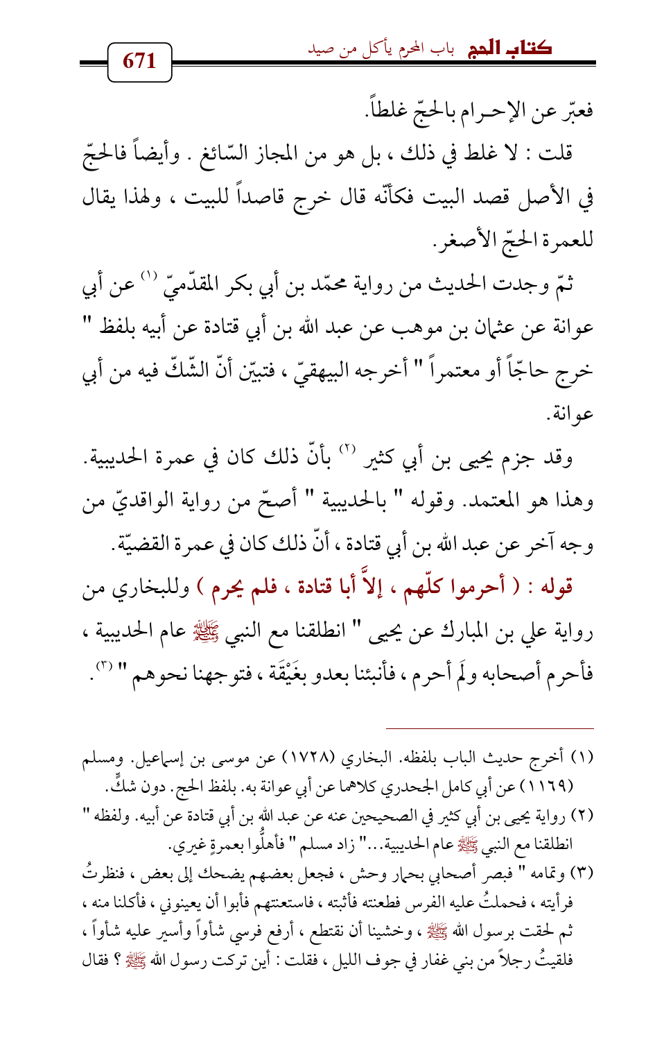 (¬2) رواية يحيى بن أبي كثير في الصحيحين عنه عن عبد الله بن أبي قتادة عن أبيه. ولفظه " انطلقنا مع النبي - صلى الله عليه وسلم - عام الحديبية ... " زاد مسلم " فأهلُّوا بعمرةٍ غيري.