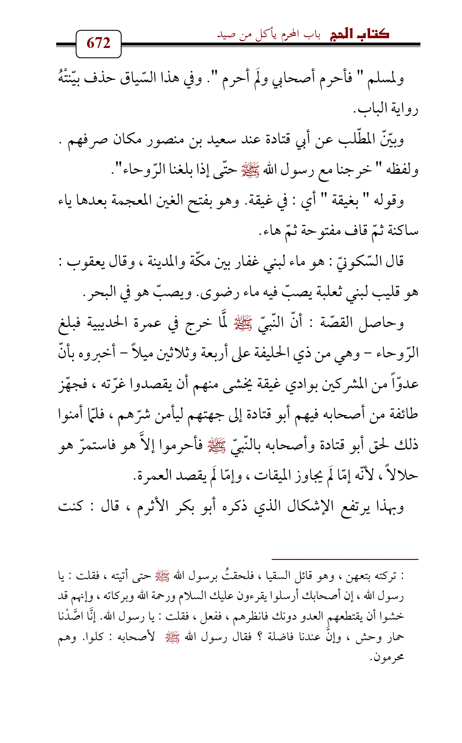 وبيّنّ المطّلب عن أبي قتادة عند سعيد بن منصور مكان صرفهم. ولفظه " خرجنا مع رسول الله - صلى الله عليه وسلم - حتّى إذا بلغنا الرّوحاء ".