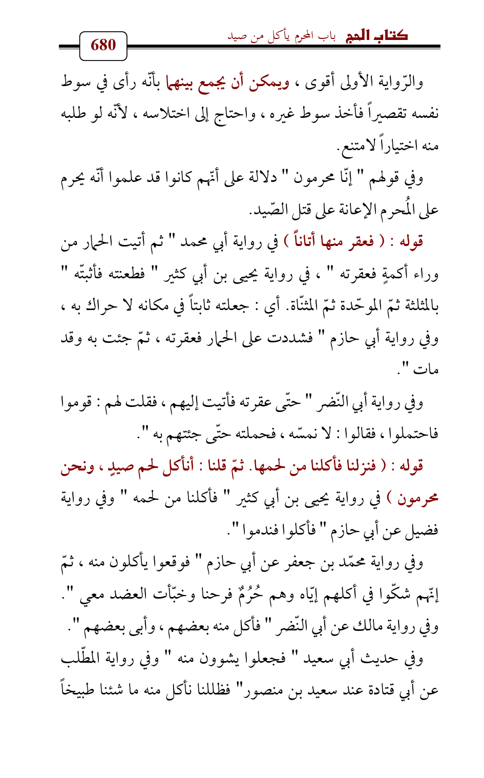 وفي رواية محمّد بن جعفر عن أبي حازم " فوقعوا يأكلون منه، ثمّ إنّهم شكّوا في أكلهم إيّاه وهم حُرُمٌ فرحنا وخبّأت العضد معي ". وفي رواية مالك عن أبي النّضر " فأكل منه بعضهم , وأبى بعضهم ".