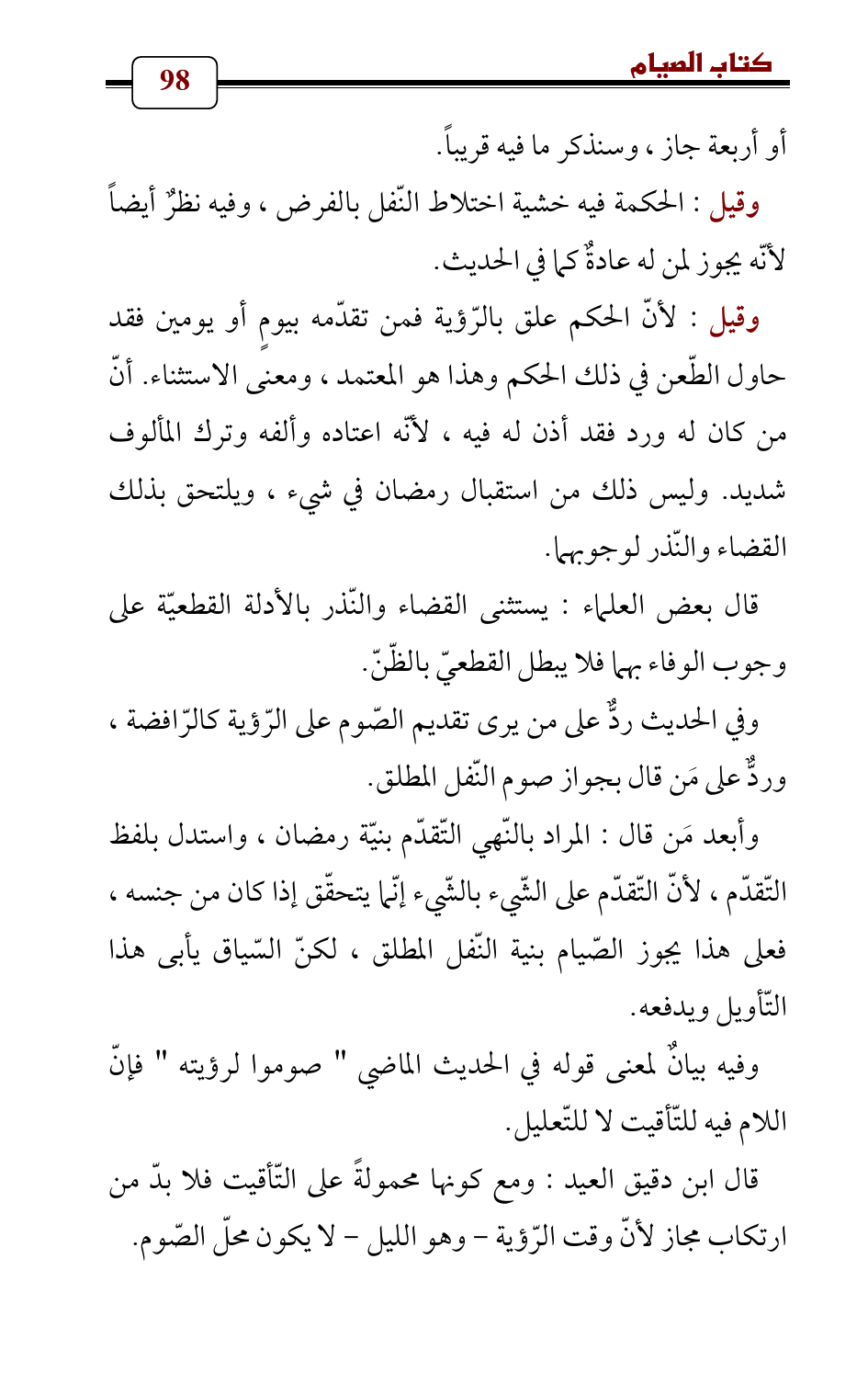 وقيل: لأنّ الحكم علق بالرّؤية فمن تقدّمه بيومٍ أو يومين فقد حاول الطّعن في ذلك الحكم وهذا هو المعتمد، ومعنى الاستثناء. أنّ من كان له ورد فقد أذن له فيه , لأنّه اعتاده وألفه وترك المألوف شديد. وليس ذلك من استقبال رمضان في شيء، ويلتحق بذلك القضاء والنّذر لوجوبهما.