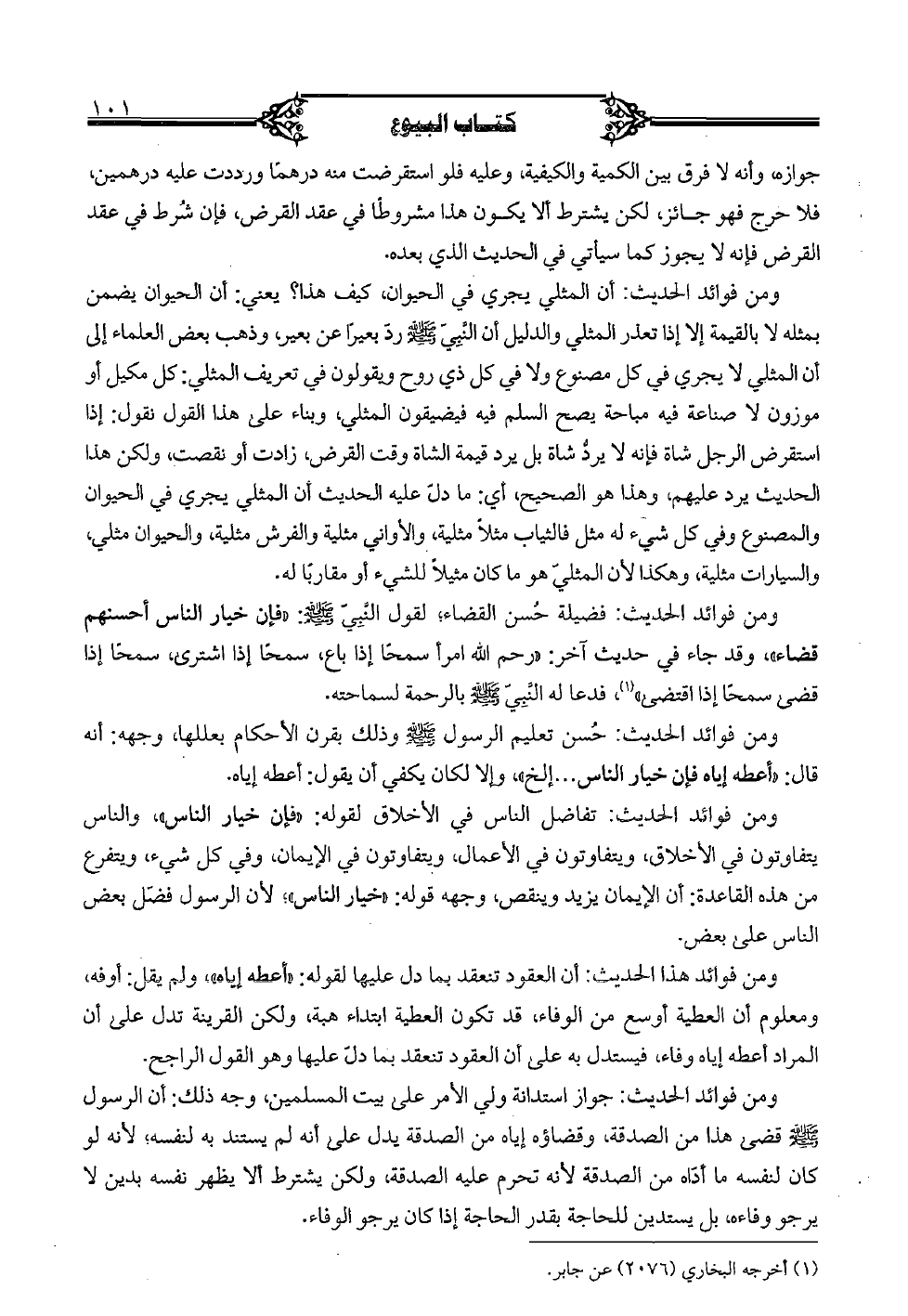 ومن فوائد الحديث: جواز استدانة ولي الأمر على بيت المسلمين، وجه ذلك: أن الرسول صلى الله عليه وسلم قضى هذا من الصدقة، وقضاؤه إياه من الصدقة يدل على أنه لم يستند به لنفسه؛ لأنه لو كان لنفسه ما أداه من الصدقة لأنه تحرم عليه الصدقة، ولكن يشترط ألا يظهر نفسه بدين لا يرجو وفاءه، بل يستدين للحاجة بقدر للحاجة إذا كان يرجو الوفاء.