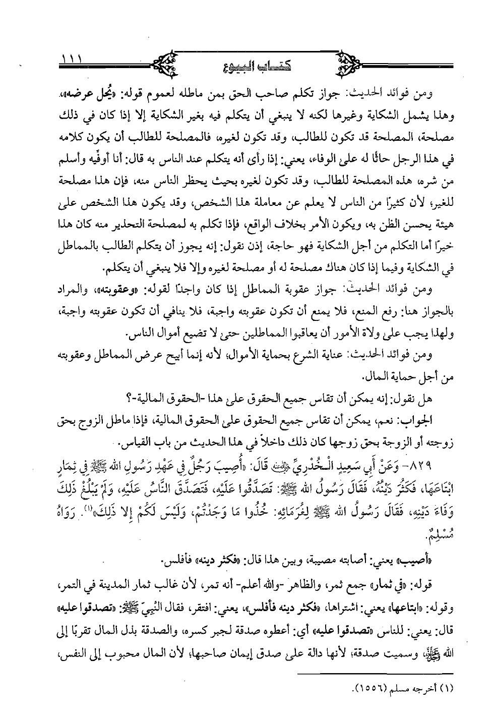 ومن فوائد الحديث: جواز تكلم صاحب الحق بمن ما طله لعموم قوله: «يحل عرضه» وهذا يشمل الشكاية وغيرها لكنه لا ينبغي أن يتكلم فيه بغير الشكاية إلا إذا كان في ذلك مصلحة، المصلحة قد تكون للطالب، وقد تكون لغيره، فالمصلحة للطالب أن يكون كلامه في هذا الرجل حاثا له على الوفاء، يعني: إذا رأى أنه يتكلم عند الناس به قال: أنا أوفيه وأسلم من شره، هذه المصلحة للطالب، وقد تكون لغيره بحيث يحظر الناس منه، فإن هذا مصلحة للغير؛ لأن كثيراً من الناس لا يعلم عن معاملة هذا الشخص، وقد يكون هذا الشخص على هيئة يحسن الظن به، ويكون الأمر بخلاف الواقع، فإذا تكلم به لمصلحة التحذير مننه كان هذا خيراً أما التكلم من أجل الشكاية فهو حاجة، إذن نقول: إنه يجوز أن يتكلم الطالب بالمماطل في الشكاية وفيما إذا كان هناك مصلحة له أو مصلحة لغيره وإلا فلا ينبغي أن يتكلم.