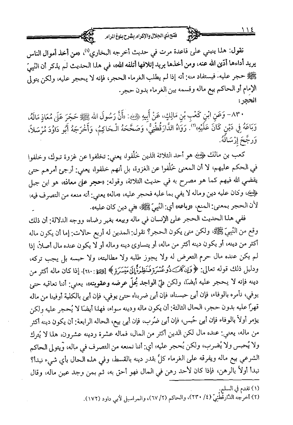 830 - وعن ابن كعب بن مالك، عن أبيه رضي الله عنه: «أن رسول الله صلى الله عليه وسلم حجر على معاذ ماله، وباعه في دين كان عليه» رواه الدارقطني، وصححه الحاكم، وأخرجه أبو داود مرسلا ورجح إرساله.