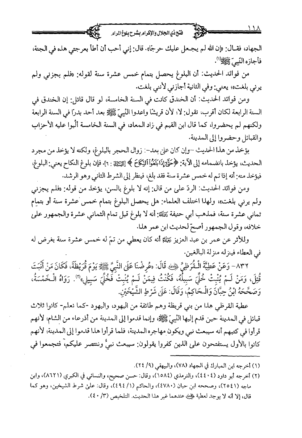 832 - وعن عطية القرطبي رضي الله عنه قال: «عرضنا على النبي صلى الله عليه وسلم يوم قريظة، فكان من أنبت قتل، ومن لم ينبت خلي سبيله، فكنت فيمن لم ينبت فخلي سبيلي» رواه الخمسة وصححه ابن حبان والحاكم، وقال: على شرط الشيخين.