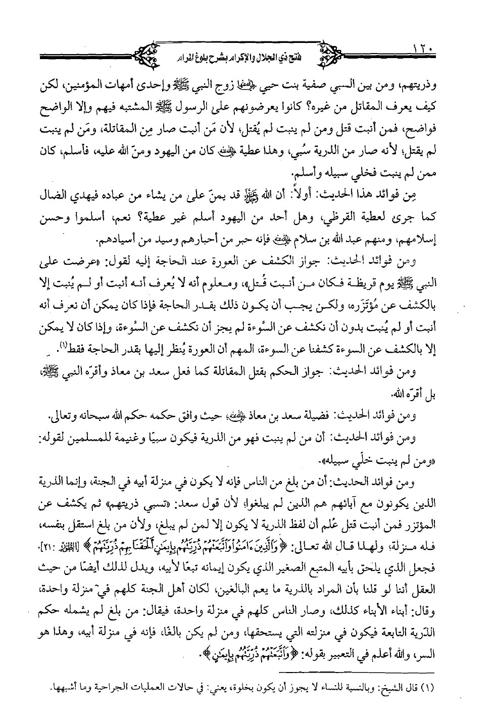 ومن فوائد الحديث: أن من بلغ من الناس فإنه لا يكون في منزلة أبيه في الجنة، وإنما الذرية الذين يكونون مع آبائهم هم الذين لم يبلغوا؛ لأن قول سعد: «تسبي ذريتهم» ثم يكشف عن المؤتزر فمن أنبت قتل علم أن لفظ الذرية لا يكون إلا لمن لم يبلغ، ولأن من بلغ استقل بنفسه، فله منزلة؛ ولهذا قال الله تعالى: {والذين أمنوا وأتبعتهم ذريتهم بإيمان ألحقنا بهم ذريتهم} [الطور: 21].