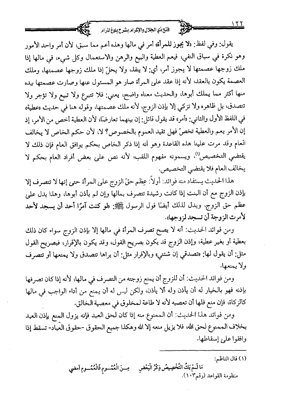 يقول: وفي لفظ: «لا يجوز للمرأة» أمر في مالها وهذه أعم مما سبق؛ لأن أمر واحد الأمور وهو نكرة في سياق النفي، فيعم العطية والبيع والرهن والاستعمال وكل شيء، في مالها إذا ملك زوجها عصمتها لا يجوز أمر، أي: لا ينفذ، ولا يحل إذا ملك زوجها عصمتها، وملك العصمة يكون بالعقد، لأنه إذا عقد على المرأة صار هو المسئول عنها وصارت عصمتها بيده منها أكثر مما يملك أبوها، والحديث معناه واضح، يعني: فلا تتبرع ولا تبيع ولا تؤجر ولا تتصدق، بل ظاهره ولا تزكي إلا بإذن الزوج، لأنه ملك عصمتها، وقوله هنا في حديث «عطية» في اللفظ الأول والثاني: «أمر» قد يقول قائل: إن بينهما تعارضاً؛ لأن العطية أخص من الأمر، إذ أن الأمر يعم والعطية تخص فهل تقيد العموم بالخصوص؟ لا، لأن حكم الخاص لا يخالف العام وقد مرت علينا هذه القاعدة وهو أنه إذا ذكر الخاص بحكم يوافق العام فإن ذلك لا يقتضي التخصيص، ويسمونه مفهوم اللقب، لأنه نص على بعض أفراد العام بحكم لا يخالف العام فلا يقتضي التخصيص.