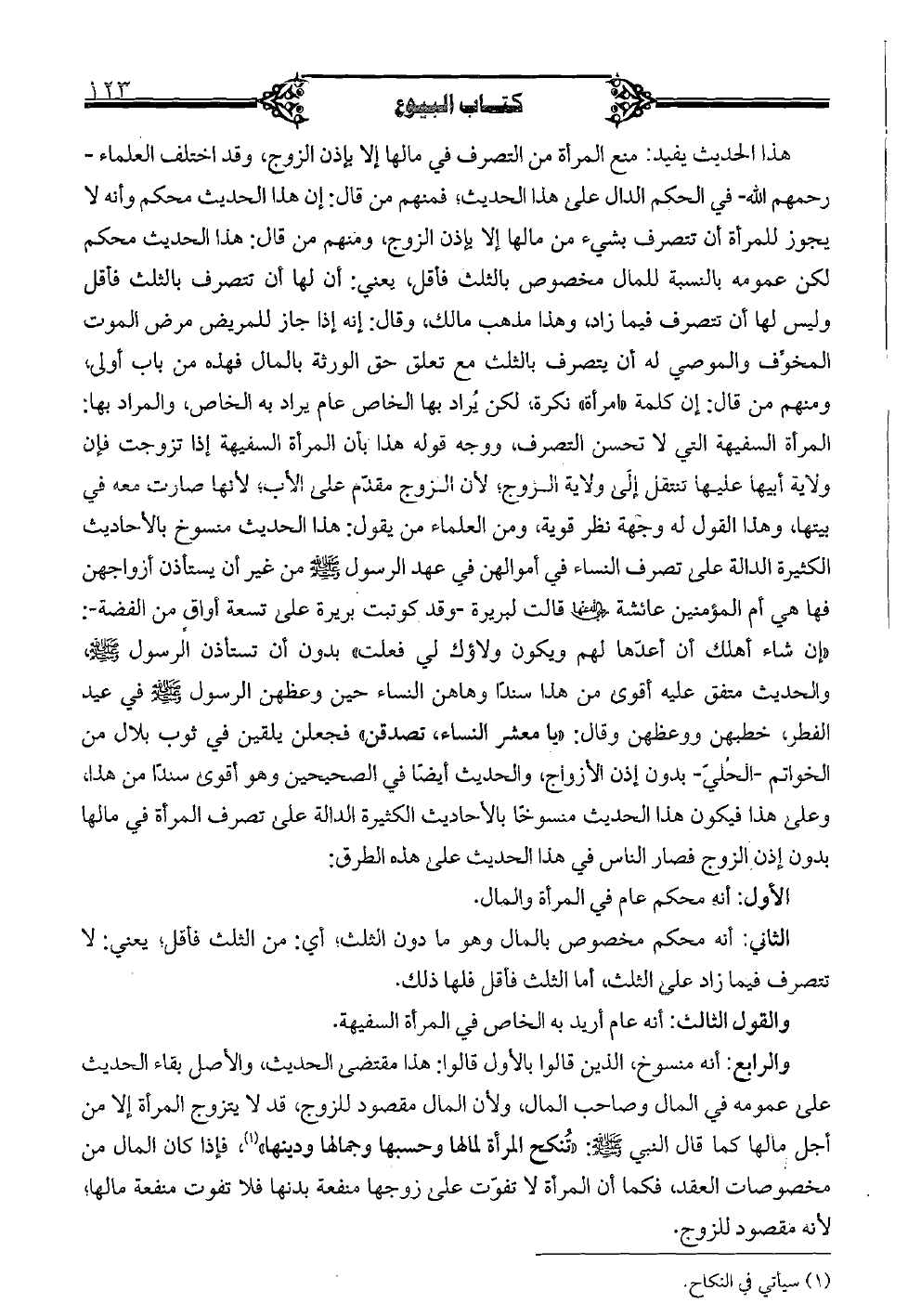 هذا الحديث يفيد: منه المرأة من التصرف في مالها إلا بإذن الزوج، وقد اختلف العلماء- رحمهم الله- في الحكم الدال على هذا الحديث؛ فمنهم من قال: إن هذا الحديث محكم وأنه لا يجوز للمرأة أن تتصرف بشيء من مالها إلا بإذن الزوج، ومنهم من قال: هذا الحديث محكم لكن عمومه بالنسبة للمال مخصوص بالثلث فأقل، يعني: أن لها أن تتصرف بالثلث فأقل وليس لها أن تتصرف فيما زاد، وهذا مذهب مالك، وقال: إنه إذا جاز للمريض مرض الموت المخوف والموصي له أن يتصرف بالثلث مع تعلق حق الورثة بالمال فهذه من باب أولى، ومنهم من قال: إن كلمة «امرأة» نكرة، لكن يراد بها الخاص عام يراد به الخاص، والمراد بها: المرأة السفيهة التي لا تحسن التصرف، ووجه قوله هذا بأن المرأة السفيهة إذا تزوجت فإن ولاية أبيها عليها تنتقل إلى ولاية الزوج، لأن الزوج مقدم على الأب؛ لأنها صارت معه في بيتها وهذا القول له وجهة نظر قوية، ومن العلماء من يقول: هذا الحديث منسوخ بالأحاديث الكثيرة الدالة على تصرف النساء في أموالهن في عهد الرسول صلى الله عليه وسلم من غير أن يستأذن أزواجهن فها هي أم المؤمنين عائشة رضي الله عنها قالت لبريرة- وقد كوتبت بريرة على تسعة أواق من الفضة: «إن شاء أهلك أن أعدها لهم ويكون ولاؤك لي فعلت» بدون أن تستأذن الرسول صلى الله عليه وسلم، والحديث متفق عليه أقوى من هذا سنداً وهاهن النساء حين وعظهن الرسول صلى الله عليه وسلم في عيد الفطر، خطبهن ووعظهن وقال: «يما معشر النساء تصدقن» فجعلن يلقين في ثوب بلال من الخواتم- الحلي- بدون إذن الأزواج، والحديث أيضاً في الصحيحين وهو أقوى سنداً من هذا، وعلى هذا فيكون هذا الحديث منسوخاً بالأحاديث الكثيرة الدالة على تصرف المرأة في مالها بدون إذن الزوج فصار الناس في هذا الحديث على هذه الطرق: