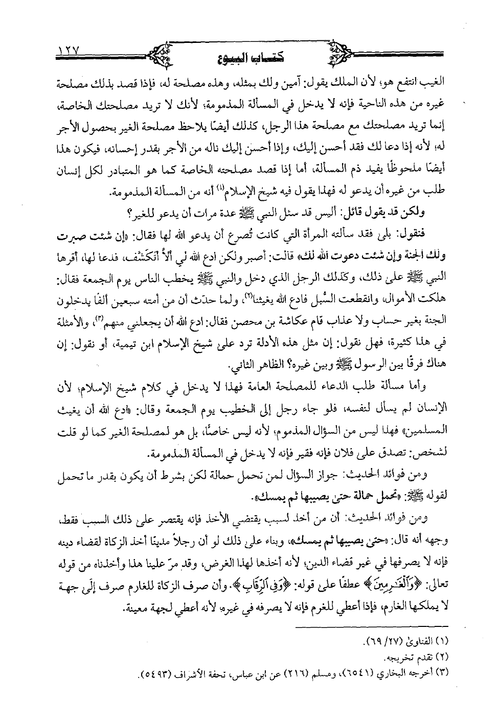 الغيب انتفع هو؛ لأن الملك يقول: آمين ولك بمثله، وهذا مصلحة له، فإذا قصد بذلك مصلحة غيره من هذه الناحية فإنه لا يدخل في المسألة المذمومة؛ لأنك لا تريد مصلحتك الخاصة، إنما تريد مصلحتك مع مصلحة هذا الرجل، كذلك أيضا يلاحظ مصلحة الغير بحصول الأجر له؛ لأنه إذا دعا لك فقد أحسن إليك، وإذا أحسن إليك ناله من الأجر بقدر إحسانه، فيكون هذا أيضا ملحوظاً يفيد ذم المسألة، أما إذا قصد مصلحته الخاصة كما هو المتبادر لكل إنسان طلب من غيره أن يدعو له فهذا يقول فيه شيخ الإسلام أنه من المسألة المذمومة.