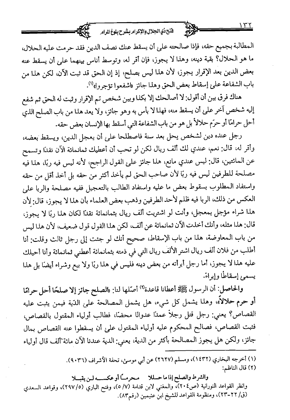 والحاصل: أن الرسول صلى الله عليه وسلم أعطانا قاعدة أصلها لنا: «الصلح جائز إلا صلحاً أحل حراماً او حرم حلالا» وهذا يشمل كل شيء، هل يشمل المصالحة على الدية فيمن يثبت عليه القصاص؟ يعني: رجل قتل رجلا عمداً عدوانا محضا، فطالب أولياء المقتول بالقصاص، فثبت القصاص: فصالح المحكوم عليه أولياء المقتول على أن يسقطوا عنه القصاص بمال جائز، ولكن هل يجوز المصالحة بأكثر من الدية، يعني: الدية عندنا الآن مائة ألف قال أولياء.