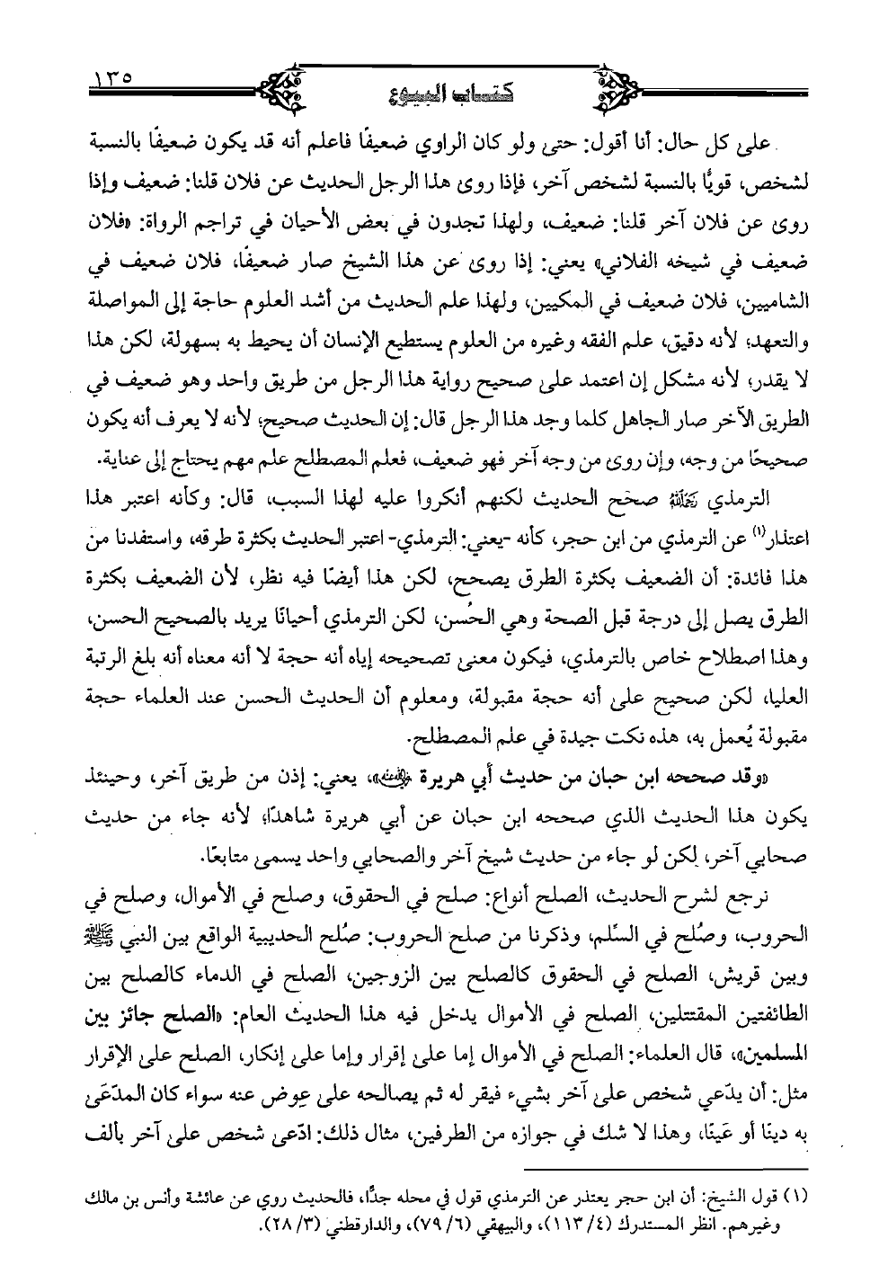 نرجع لشرح الحديث، الصلح أنواع: صلح في الحقوق، وصلح في الأموال، وصلح في الحروب، وصلح في السلم، وذكرنا من صلح الحروب/ صلح الحديبية الواقع بين النبي صلى الله عليه وسلم وبين قريش، الصلح في الحقوق كالصلح بين الزوجين، الصلح في الدماء كالصلح بين الطائفتين المقتتلين، الصلح في الأموال يدخل فيه هذا الحديث العام: «الصلح جائز بين المسلمين» قال العلماء: الصلح في الأموال إما على إقرار وإما على إنكار، الصلح على الإقرار مثل: أن يدعي شخص على آخر بشيء فيقر له ثم يصالحه على عوض عنه سواء كان المدعي به ديناً أو عيناًن وهذا لا شك في جوازه من الطرفين، مثال ذلك: ادعى شخص على آخر بألف