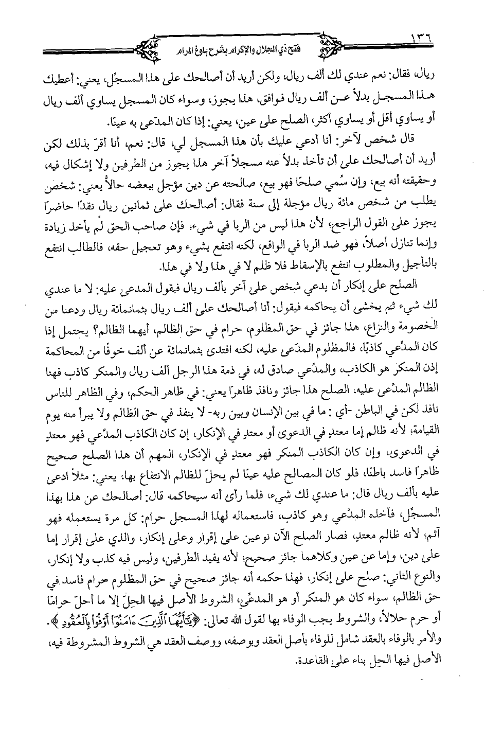 الصلح على إنكار أن يدعي شخص على آخر بألف ريال فيقول المدعي عليه: لا ما عندي لك شيء ثم يخشى أن يحاكمه فيقول: أنا أصالحك على ألف ريال بثمانمائة ريال ودعنا من الخصومة والنزاع، هذا جائز في حق المظلوم، حرام في حق الظالم، أيهما الظالم؟ يحتمل إذا كان المدعي كاذبا، فالمظلوم المدعي عليه، لكنه افتدى بثمانمائة عن ألف خوفاً من المحاكمة إذن المنكر هو الكاذب، والمدعي صادق له، في ذمة هذا الرجل ألف ريال والمنكر كاذب فهنا الظالم المدعى عليه، الصلح هذا جائز ونافذ ظاهراً يعني: في ظاهر الحكم، في الظاهر للناس نافذ لكن في الباطن- أي: ما في بين الإنسان وبين ربه- لا ينفذ في حق الظالم ولا يبرأ منه يوم القيامة؛ لأنه ظالم إما معتد في الدعوى أو معتد في الأنكار، إن كان الكاذب المدعي فهو معتد في الدعوى، وإن كان الكاذب المنكر فهو معتد في الإنكار، إن كان الكاذب المدعي فهو معتد في الدعوى، وإن الكاذب المنكر فهو معتد في الإنكار، المهم أن هذا الصلح صحيح ظاهراً فاسد باطناً، فلو كان المصالح عليه عينا لم يحل للظالم الانتفاع بها، يعني: مثلا ادعى عليه بألف ريال قال: ما عندي لك شيء، فلما رأى أنه سيحاكمه قال: أصالحك عن هذا بهذا المسجل، فأخذه المدعي وهو كاذب فاستعماله لهذا المسجل حرام: كل مرة يستعمله فهو آثم، لأنه ظالم معتد فصار الصلح الآن نوعين على إقرار وعلى إنكار، والذي على إقرار إما على دين، وإما عن عين وكلاهما جائز صحيح، لأنه يفيد الطرفين، وليس فيه كذب ولا إنكار، والنوع الثاني: صلح على إنكار فهذا حكمه أنه جائز صحيح في حق المظلوم حرام فاسد في حق الظالم، سواء كان هو المنكر أو هو المدعي، الشروط الأصل فيها الحل إلى ما أحل حراماً أو حرم حلالاً، والشروط يجب الوفاء بها لقول الله تعالى: {يا أيها الذين أمنوا أوفوا بالعقود}.