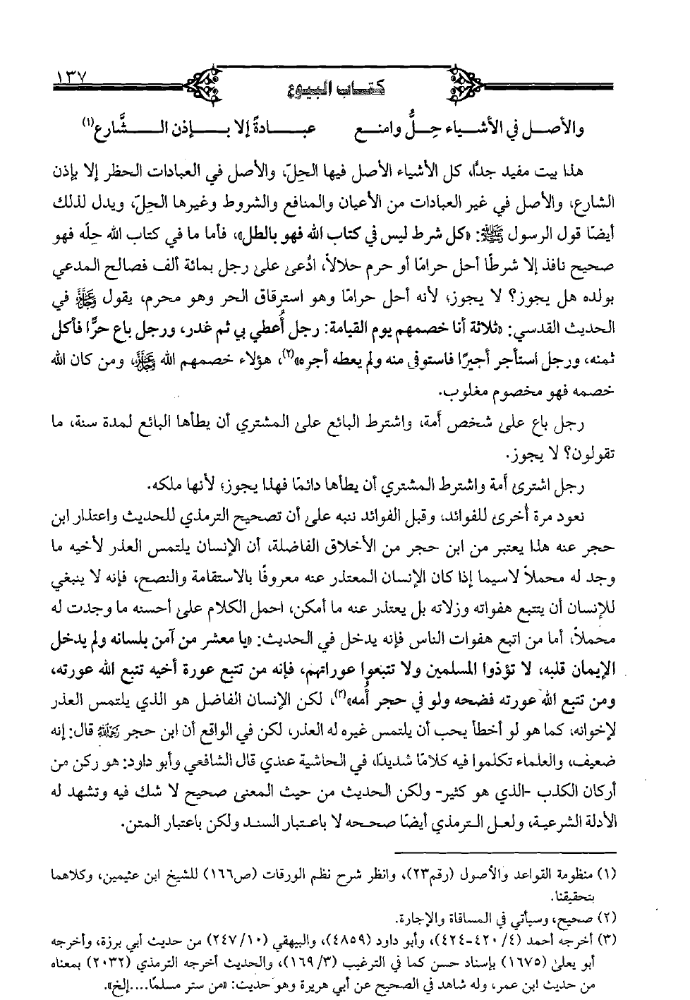 هذا بيت مفيد جداً، كل الأشياء الأصل فيها الحل، والأصل في العبادات الحظر إلا بإذن الشارع، والأصل في غير العبادات من الأعيان، والمنافع والشروط وغيرها الحل، ويدل لذلك أيضا قول الرسول صلى الله عليه وسلم: «كل شرط ليس في كتاب الله فهو بالطل» فأما ما في كتاب الله حله فهو صحيح نافذ إلا شرطا أحل حراما أو حرم حلالا، ادعى على رجل بمائة ألف صالح المدعي بولده هل يجوز؟ لا يجوز، لأنه أحل حراماً وهو استرقاق الحر وهو محرم، يقول عز وجل في الحديث القدسي: «ثلاثة أنا خصمهم يوم القيامة: رجل أعطي بي ثم غدر، ورجل باع حراً فأكل ثمنه، ورجل استأجر أجيراً فاستوفى منه ولم يعطه أجره» هؤلاء خصمهم الله عز وجل، ومن كان الله خصمه فهو مخصوم مغلوب.