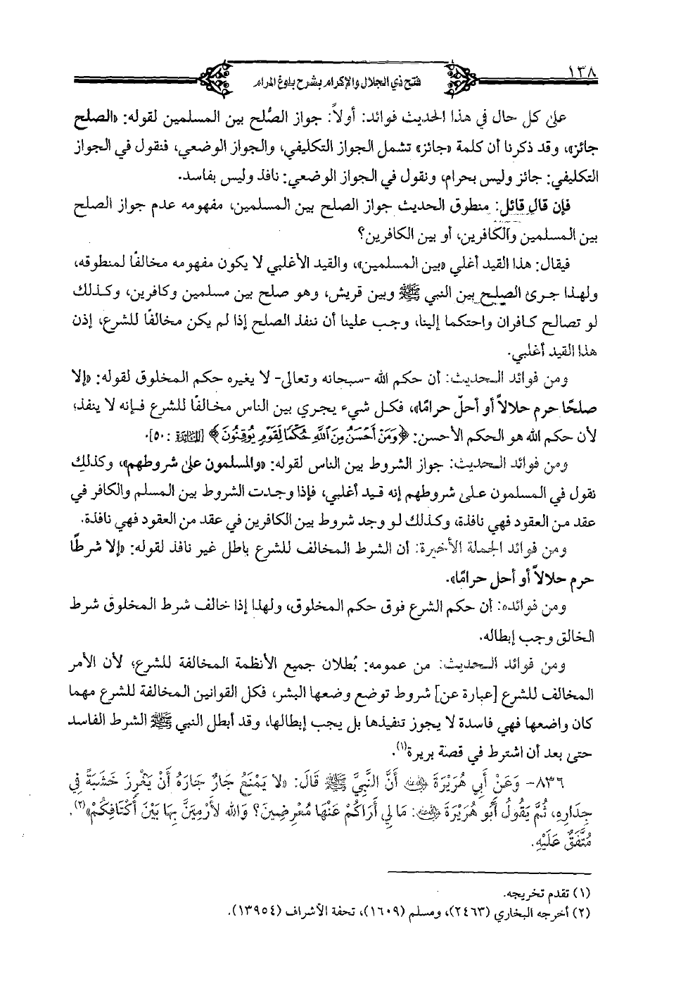 فيقال: هذا القيد أغلي «بين المسلمين» والقيد الأغلبي لا يكون مفهومه مخالفاً لمنطوقه، ولهذا جرى الصلح بين النبي صلى الله عليه وسلم وبين قريش، وهو صلح بين مسلمين وكافرين، وكذلك لو تصالح كافران واحتكما إلينا، وجب علينا أن ننفذ الصلح إذا لم يكن مخالفاً للشرع، إذن هذا القيد أغليي.