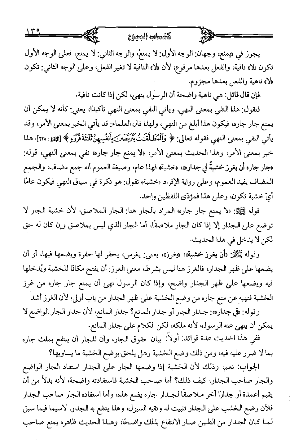فنقول: هذا النفي بمعنى النهي، ويأتي النفي بمعنى النهي تأكيداً، يعني: كأنه لا يمكن أن يمنع جار جاره، فيكون هذا أبلغ من النهي، ولهذا قال العلماء: قد يأتي الخبر بمعنى الأمر وقد يأتي النفي بمعنى النهي فقوله تعالى: {والمطلقات يتربصن بأنفسهن ثلاثة قروء} [البقرة: 228] هذا خبر بمعنى الأمر، وهذا الحديث بمعنى الأمر، «لا يمنع جار جاره» نفي بمعنى النهي، قوله: «جار جاره أن يغرز خشبة في جداره» «خشبة» فهذا عام، وصيغة العموم أنه جمع مضاف، والجمع المضاف يفيد العموم، وعلى رواية الإفراد «خشبة» نقول: هو نكرة في سياق النهي فيكون عاماً أي خشبة تكون، على هذا فمؤدى اللفظين واحد.