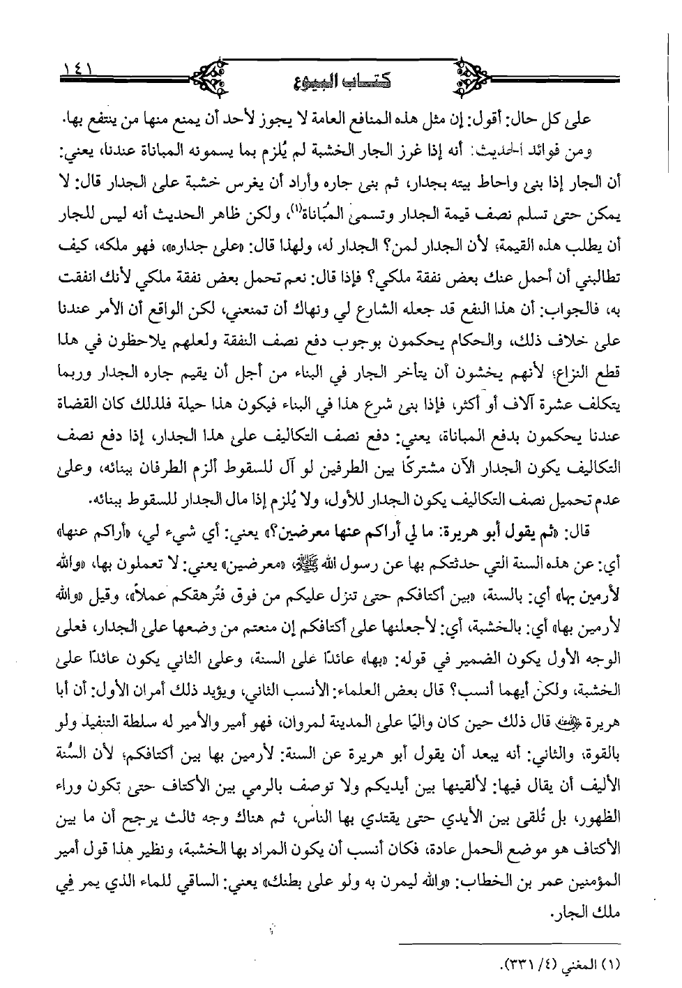 قال: «ثم يقول أبو هريرة: ما لي أراكم عنها معرضين؟ » يعني: أي شيء لي «أراكم عنها» أيك عن هذه السنة التي حدثتكم بها عن رسول الله صلى الله عليه وسلم «معرضين» يعني: لا تعملون بها، «والله لأرمين بها» أي: بالسنة، «بين أكتافكم حتى تنزل عليكم من فوق فترهقكم عملاً» وقيل: «والله لأرمين بها» أي: بالخشبة، أي: لا جعلنها على أكتافكم إن منعتم من وضعها على الجدار، فعلى الوجه الأول يكون الضمي في قوله: «بها» عائداً على السنة، وعلى الثاني يكون عائداً على الخشبة، ولكن أيهما أنسب؟ قال بعض العلماء: الأنسب الثاني، ويؤيد ذلك أمران الأول: أن أبا هريرة رضي الله عنه قال ذلك حين كان والياً على المدينة لمروان فهو أمير والأمير له سلطة التنفيذ ولو بالقوة، والثاني: أنه يبعد أن يقول أبو هريرة عن السنة: لأرمي نبها بين أكتافكم؛ لأن السنة الأليف أن يقال فيها: لألقينها بين أيديكم ولا توصف بالرمي بين الأكتاف حتى تكون وراء الظهور، بل تلقى بين الأيدي حتى يقتدي بها الناس، ثم هناك وجه ثالث يرجح أن ما بين الأكتاف هو موضع الحمل عادة، فكان أنسب أن يكون المراد بها الخشبة، ونظير هذا قول أمير المؤمنين عمر بن الخطاب: «والله ليمرن به ولو على بطنك» يعني: الساقي للماء الذي يمر في ملك الجار.