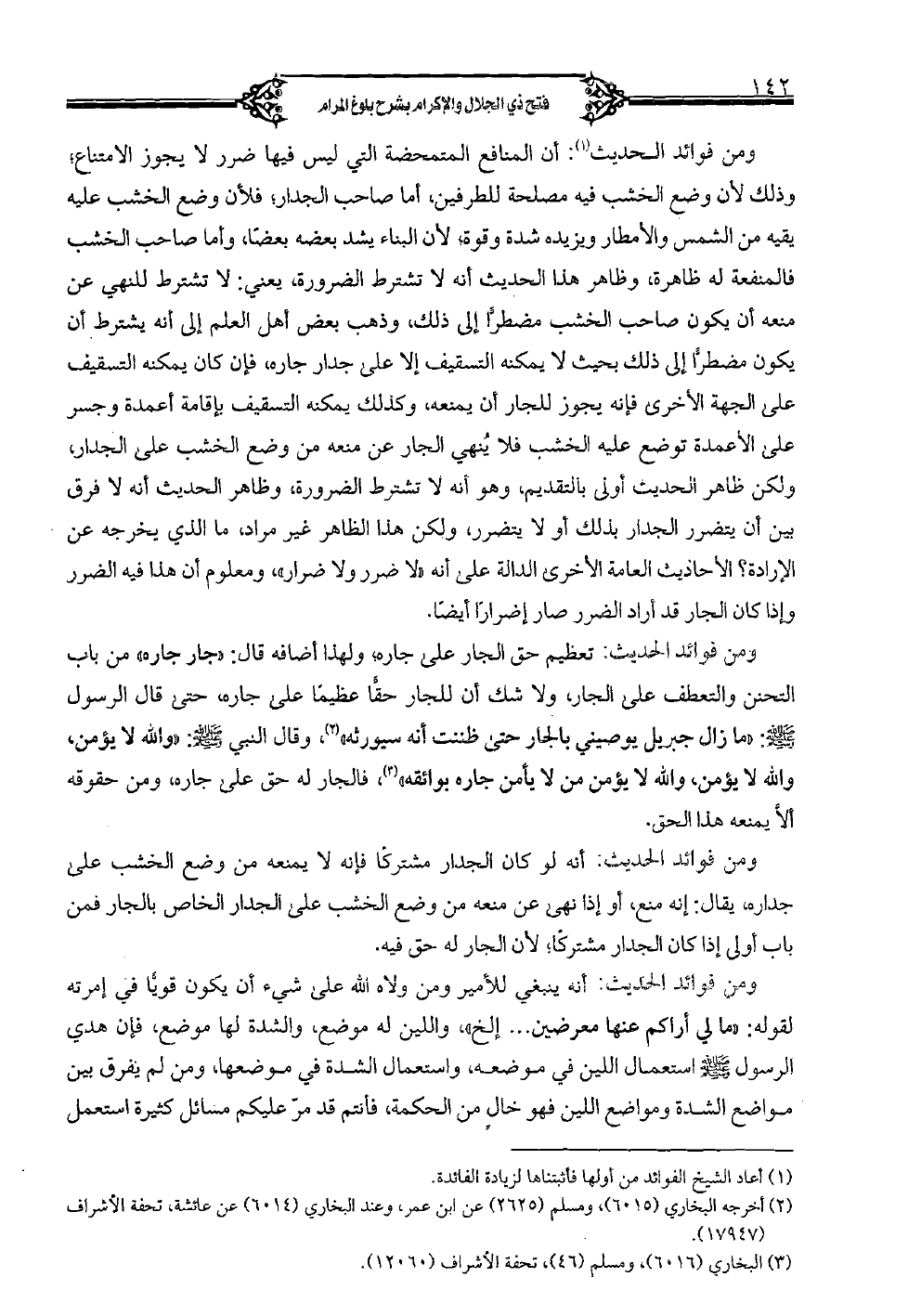 ومن فوائد الحديث: أن المنافع المتحمضة التي ليس فيها ضرر لا يجوز الامتناع؛ وذلك لأن وضع الخشب فيه مصلحة للطرفين؛ أما صاحب الجدار؛ فلأن وضع الخشب عليه يقيه من الشمس والأمطار ويزيده شدة وقوة، لأن البناء يشد بعضه بعضا، وأما صاحب الخشب فالمنفعة له ظاهرة، وظاهر هذا الحديث أنه لا يشترط الضرورة، يعني: لا تشترط للنهي عن منعه أن يكون صاحب الخشب مضطراً إلى ذلك، وذهب بعض أهل العلم إلى أنه يشترط أن يكون مضطراً إلى ذلك بحيث لا يمكنه التسقيف إلا على جدار جاره، فإن كان يمكنه التسقيف على الجهة الأخرى فإنه يجوز للجار أن يمنعه، وكذلك يمكنه التسقيف بإقامة أعمدة وجسر على الأعمدة توضع عليه الخشب فلا ينهي الجار عن منعه من وضع الخشب على الجدار، ولكن ظاهر الحديث أولى بالتقديم، وهو أنه لا تشترط الضرورة، وظاهر الحديث أنه لا فرق بين أن يتضرر الجدار بذلك أو لا يتضرر، ولكن هذا الظاهر غير مراد، ما الذي يخرجه عن الإرادة؟ الأحاديث العامة الأخرى الدالة على أنه «لا ضرر ولا ضرار» ومعلوم أن هذا فيه الضرر وإذا كان الجار قد أراد الضرر صار إضراراً أيضا.