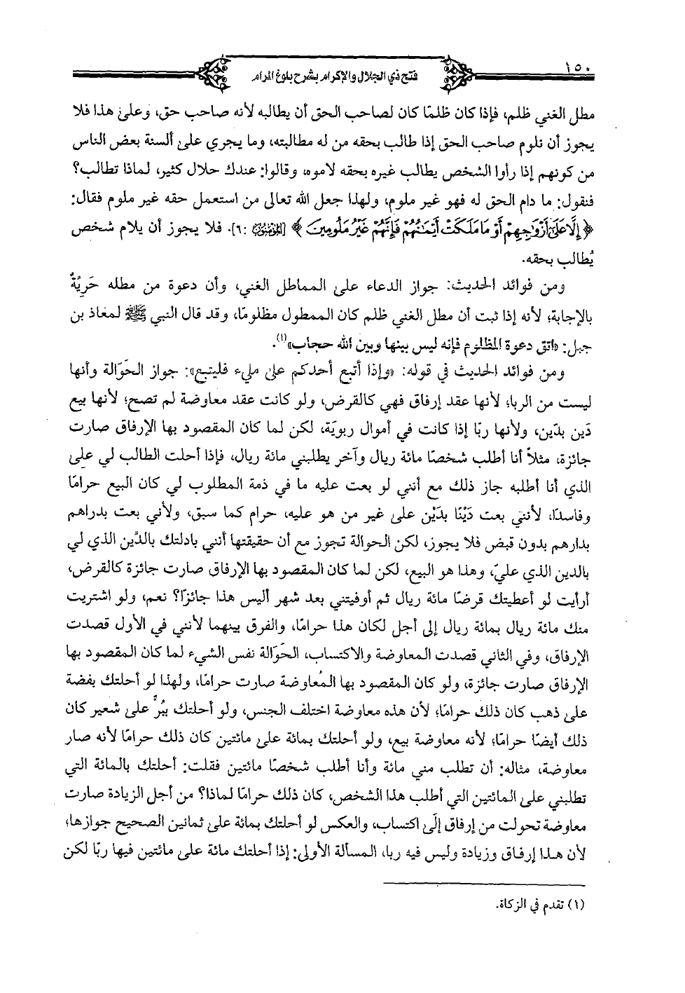 ومن فوائد الحديث في قوله: «وإذا أتبع أحدكم على مليء فليتبع» جواز الحوالة وأنها ليست من الربا؛ لأنها عقد إرفاق فهي كالقرض ولو كانت عقد معاوضة لم تصح، لأنها بيع دين بدين، ولأنها ربا إذا كانت في أموال ربوية، ولكن لما كان المقصود بها الإرفاق صارت جائزة، مثلا أنا أطلب شخصاً مائة ريال وآخر يطلبني مائة ريال، فإذا أحلت الطالب لي على الذي أنا أطلبه جاز ذلك مع أنني لو بعت عليه ما في ذمة المطلوب لي كان البيع حراماً وفاسداً، لأنني بعت دينا بدين على غير من هو عليه، حرام كما سبق، ولأني بعت بدراهم بدراهم بدون قبض فلا يجوز، لكن الحوالة تجوز مع أن حقيقتها أنني بادلتك بالدين الذي لي بالدين الذي علي، وهذا هو البيع، ولكن لما كان المقصود بها الإرفاق صارت جائزة كالقرض، أرأيت لو أعطيتك قرضا مائة ريال ثم أوفيتني بعد شهر أليس هذا جائزاً؟ نعم، ولو اشتريت منك مائة ريال بمائة ريال إلى أجل لكان هذا حراماً، والفرق بينهما لأنني في الأول قصدت لإرفاق، وفي الثاني قصدت المعاوضة والاكتساب، والحوالة نفس الشيء لما كان المقصود بها الإرفاق صارت جائزة، ولو كان المقصود بها المعاوضة صارت حراماً، ولهذا لو أحلت بفضة على ذهب كان ذلك حراماً، لأن هذه معاوضة اختلف الجنس، ولو أحلتك ببر على شعير كان ذلك أيضا حراماً؛ لأنه معاوضة بيع، ولو أحلتك بمائة على مائتين كان ذلك حراماً لأنه صار معاوضة، مثال: أن تطلب مني مائة وأنا أطلب شخصا مائتين فقلت: أحلتك بالمائة التي تطلبني على المائتين التي أطلب هذا الشخص، كان ذلك حراماً لماذا؟ من أجل الزيادة صارت معاوضة تحولت من إرفاق إلى اكتساب والعكس لو أحلتك بمائة على ثمانين الصحيح جوازها؛ لأن هذا إرفاق وزيادة وليس فيه ربا، المسألة الأولى: إذا أحلتك مائة على مائتين فيها ربا لكن