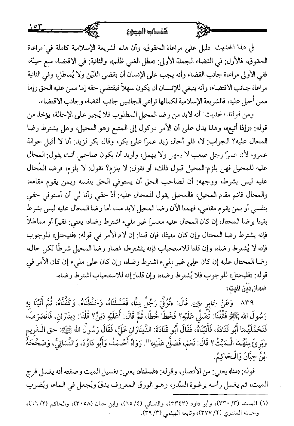 839 - وعن جابر رضي الله عنه قال: «توفي رجل منن فغسلناه وحنطناه، وكفناه ثم أتينا به رسول الله صلى الله عليه وسلم فقلنا: تصلي عليه؟ فخطا خطأ، ثم قال: أعليه دين؟ قلنا: ديناران، فانصرف فتحملهما أبو قتادة، فأتيناه، فقال أبو قتادة: الديناران علي، فقال رسول الله صلى الله عليه وسلم: حق الغريم وبريء منهما الميت؟ قال: نعم، فصلى عليه» رواه أحمد وأبو داود، والنسائي وصححه ابن حبان والحاكم.