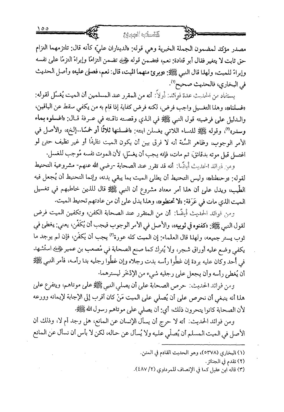 ومن فوائد الحديث أيضا: أنه قد تقرر عند الصحابة رضي الله عنهم- مشروعية التحنيط لقوله: «وحنطماه» وليس التحنيط أن يطلي الميت بما يبقي بدنه، وإنما التحنيط أن يجعل فيه الطيب، ويدل على أن هذا أمر معتاد مشروع أن النبي صلى الله عليه وسلم قال للذين خاطبهم في تغسيل الميت الذي مات في عرفة: «لا تحنطوه» وهذا يدل على أن من عاتهم تحنيط الميت.