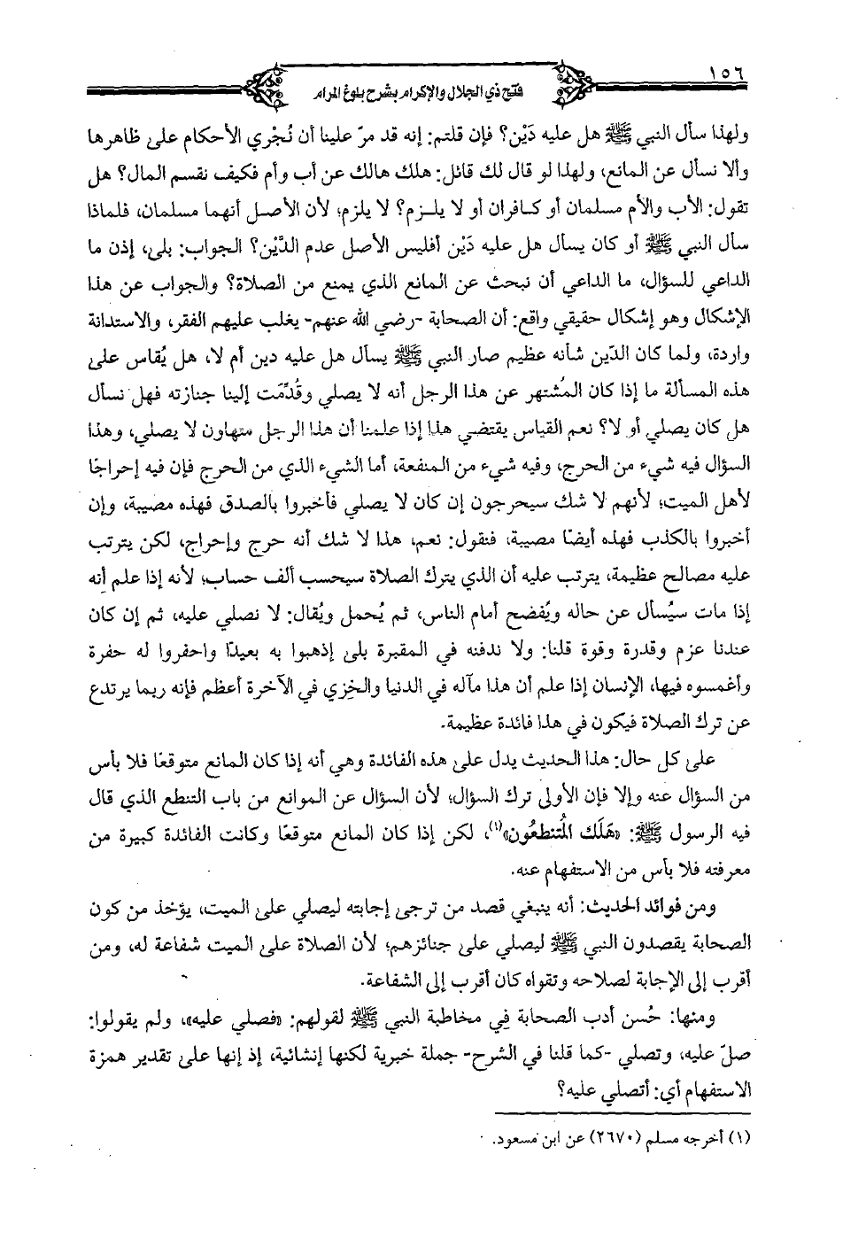 ولهذا سأل النبي صلى الله عليه وسلم هل عليه دين؟ فإن قلتم: إنه قد مر علينا أن نجري الأحكام على ظاهرها وألا نسأل عن المانع، ولهذا لو قال لك قائل: هلك هالك عن أبي وأم فكيف نقسم المال؟ هل تقول: الأب والأم مسلمان أو كافران أو لا يلزم؟ لا يلزم، لأن الأصل أنهما مسلمان، فلماذا سأل النبي صلى الله عليه وسلم أو كان يسأل هل عليه دين أفليس الأصل عدم الدين؟ الجواب: بلى، إذن ما الداعي للسؤال ما الداعي أن نبحث عن المانع الذي يمنع من الصلاة؟ والجواب عن هذا الإشكال وهو إشكال حقيقي واقع: أن الصحابة- رضي الله عنهم- يغلب عليهم الفقر، والاستدانة واردة، ولما كان الدين شأنه عظيم صار النبي صلى الله عليه وسلم يسأل هل عليه دين أم لا، هل يقاس على هذه المسألة ما إذا كان المشتهر عن هذا الرجل أنه لا يصلي وقدمت إلينا جنازته فهل نسأل هل كان يصلي أو لا؟ نعم القياس يقتضي هذا إذا علمنا أن هذا الرجل متهاون لا يصلي وهذا السؤال فيه شيء من الحرج، وفيه شيء من المنفعة، أما الشيء الذي من الحرج فإن فيه إحراجاً لأهل الميت، لأنهم لا شك سيحرجون إن كان لا يصلي فأخبروا بالصدق فهذه مصيبة، وإن أخبروا بالكذب فهذه أيضا مصيبة، فنقول: نعم، هذا لا شك أنه حرج وإحراج، لكن يترتب عليه مصالح عظيمة، يترتب عليه أن الذي يترك الصلاة سيحسب ألف حساب، ولأنه إذا علم أنه إذا مات سيسأل عن حاله ويفضح أمام الناس، ثم يحمل ويقال: لا نصلي عليه، ثم إن كان عندنا عزم وقدرة وقوة قلنا: ولا ندفنه في المقبرة بلي إذهبوا به بعيدا واحفروا له حفرة وأغمسوه فيها، الإنسان إذا علم أن هذا مآله في الدنيا والخزي في الآخرة أعظم فإنه ربما يرتدع عن ترك الصلاة فيكون في هذا فائدة عظيمة.
