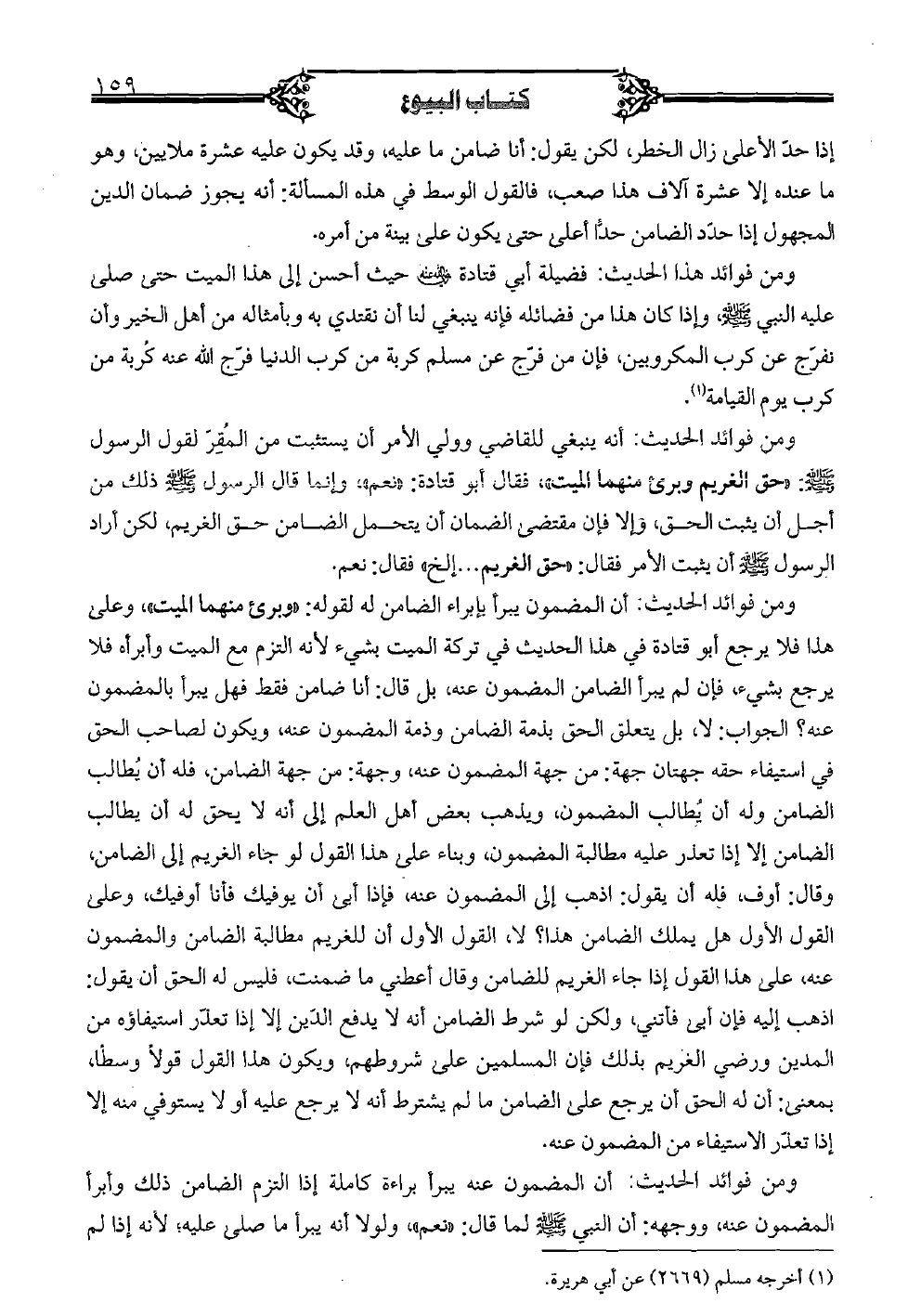 ومن فوائد الحديث: أن المضمون يبرأ بإبراء الضامن له لقوله: «وبرئ منهما الميت» وعلى هذا فلا يرجع أبو قتادة في هذا الحديث في تركة الميت بشيء لأنه التزم مع الميت وأبرأه فلا يرجع بشيء، فإن لم يبرأ الضامن المضمون عنه، بل فأن: أنا ضامن فقط فهل يبرأ بالمضمون عنه؟ الجواب: لا، بل يتعلق الحق بذمة الضامن وذمة المضمون عنه، ويكون لصاحب الحق في استيفاء حقه جهتان جهة: من جهة المضمون عنه، وجهة: من جهة الضامن، فله أن يطالب الضامن وله أن يطالب المضمون، ويذهب بعض أهل العلم إلى أنه لا يحق له أن يطالب الضامن إلا إذا تعذر عليه مطالبة المضمون، وبناء على هذا القول لو جاء الغريم إلى الضامن، وقل: أوف، فله أن يقول: أذهب إلى المضمون عنه، فإذا أبى أن يوفيك فأنا أوفيك، وعلى القول الأول هل يملك الضامن هذا؟ لا، القول الأول أن للغريم مطالبة الضامن والمضمون عنه، على هذا القول إذا جاء الغريم للضامن وقال أعطني ما ضمنت، فليس له الحق أن يقول: أذهب إليه فإن أبي فأتني، ولكن لو شرط الضامن أنه لا يدفع الدين إلا إذا تعذر استفاؤه من المدين ورضي الغريم بذلك فإن المسلمين على شروطهم، ويكون هذا القول قولاً وسطاً بمعنى أن له الحق أن يرجع على الضامن ما لم يشترط أنه لا يرجع عليه أو لا يستوفي منه إلا إذا تعذر الاستيفاء من المضمون عنه.