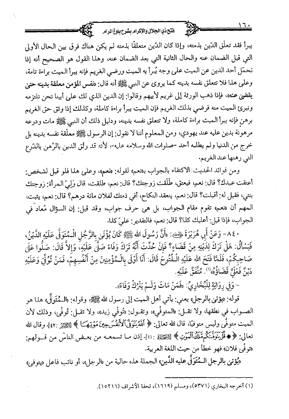 840 - وعن أبي هريرة رضي الله عنه: «أن رسول الله صلى الله عليه وسلم كان يؤتى بالرجل المتوفى عليه الدين، فيسأل: هل ترك لدينه من قضاء؟ فإن حدث أنه ترك وفاء صلى عليه، وإلا قال: صلوا على صاحبكم، فلما فتح الله عليه الفتوح قال: أنا أولى بالمؤمنين من أنفسهم، فمن توفي وعليه دين فعلي قضاؤه» متفق عليه.