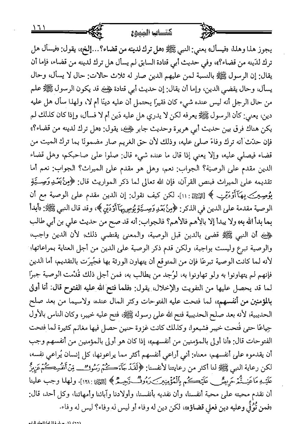 يجوز هذا وهذا، «فيسأل» يعني: النبي صلى الله عليه وسلم «هل ترك لدينه من قضاء؟ إلخ» يقول: «فيسال هل ترك لدينه من قضاء؟ » وفي حديث أبي قتادة السابق لم يسأل هل ترك لدينه من قضاء، فإما أن يقال: إن الرسول صلى الله عليه وسلم بالنسبة لمن عليهم الدين صار له ثلاث حالات: حال لا يسال، وحال يسأل وحال يقضي الدين، وإما أن يقال: إن حديث أبي قتادة رضي الله عنه قد يكون الرسول صلى الله عليه وسلم علم من حال الرجل أنه ليس عنده شيء كان فقيراً يحتمل أن عليه ديناً أم لا، ولهذا سأل هل عليه دين، يعني: كأن الرسول صلى الله عليه وسلم يعرفه لكن لا يدري هل عليه دين أم لا فسال، وإذا كان كذلك لم يكن هناك فرق بين حديث أبي هريرة وحديث جابر رضي الله عنه، يقول: «هل ترك لدينه من قضاء؟ » فإن حدث أنه ترك وفائ صلى عليه، وذلك لأن حق الغريم صار مضمونا بما ترك الميت من قضاء فيصلي عليه، وإلا يعني إذا قال ما عنده شيء قال: صلوا على صاحبكم، وهل قضاء الدين مقدم على الوصية؟ الجواب: نعم، وهل هو مقدم على الميراث؟ الجواب: نعم أما تقديمه على الميراث فبنص القرآن، فإن الله تعالى لما ذكر المواريث قال: {من بعد وصية يوصين بها أودين} [النساء: 11] لكن كيف نقول: إن الدين مقدم على الوصية مع أن لوصية مقدمة على الدين في الذكر: {من بعد وصية يوصي بها أودين} وقد قال النبي صلى الله عليه وسلم «ابدأ فيما بدأ الله به» ولا يبدأ إلا بالأهم فالأهم؟ فالجواب: أنه قد صح من حديث علي بن أبي طالب رضي الله عنه أن النبي صلى الله عليه وسلم قضى بالدين قبل الوصية، والمعنى يقتضي ذلك، لأن الدين واجب، والوصية تبرع ليست بواجبة، ولكن قدم ذكر الوصية على الدين من أجل العناية بمراعاتها؛ لأنه لما كانت الوصية تبرعاً فإن من المتوقع أن يتهاون الورثة بها فجبرت بالتقديم، أما الدين فإنهم لم يتهاونوا به ولو تهاونوا به، لوجد من يطالب به، فمن أجل ذلك قدمت الوصية جبراً لما قد يحصل عليها من التفويت والإخلال، ويقول: «فلما فتح الله عليه الفتوح قال: أنا أولى بالمؤمنين من أنفسهم» لما فتحت عليه الفتوحات وكثر المال عنده، ولاسيما من بعد صلح الحديبية لأنه بعد صلح الحديبية فتح الله على رسول صلى الله عليه وسلم فتح عليه خيب، وكان الناس بالأول أجياعا حتى فتحت خيبر فشبعوا وكذلك كانت غزوة حنين حصل فيها مغانم كثيرة لما فتحت الفتوحات قال: «أنا أولى بالمؤمنين من أنفسهم» إذا كان هو أولى بالمؤمنين من أنفسهم وجب أن يقدموه على أنفسهم، معناه: أني أراعي أنفسهم، إذا كان هو أولى بالمؤمنين من أنفسهم وجب أن يقدموه على أنفسهم، معناه: أني أراعي أنفسهم أكثر مما يراعونها كل إنسان يراعي نفسه، لكن رعاية النبي صلى لله عليه وسلم لنا أكثر من رعايتنا لأنفسنا: {لقد جاءكم رسول من أنفسكم عزيز عليه ما عنتم حريص عليكم بالمؤمنين رءوف رحيم} [التوبة: 128] وهذا وجب علينا أن نقدم محبته على محبة أنفسنا، وأن نفديه بأنفسنا، وأولادنا وآبائنا وأمهاتنا وكل أحد، قال: «فمن توفي وعليه دين فعلي قضاؤه» لكن دين له وفاء أو ليس له وفاء؟ ليس له وفاء.