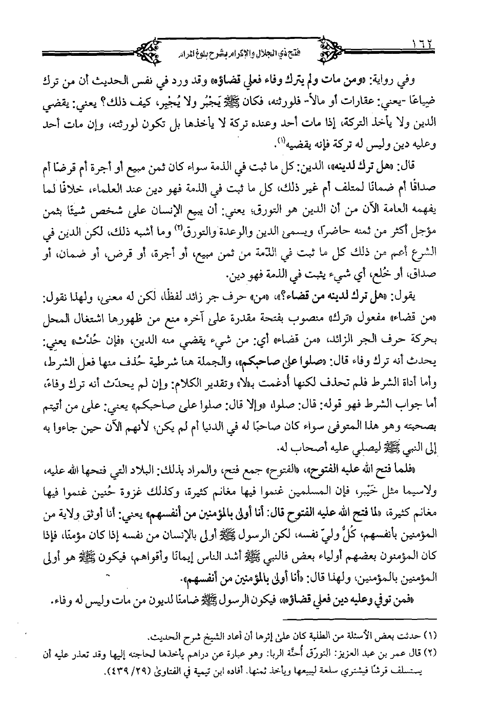 وفي رواية: «من مات ولم يترك وفاء فعلي قضاؤه» وقد ورد غب نفس الحديث أن من ترك ضياعاً- يعني: عقارات ومالاً- فلورثته، فكان صلى الله عليه وسلم يجبر ولا يجبر كيف ذلك؟ يعني: يقضي الدين ولا يأخذ التركة، إذا مات أحد وعنده تركة لا يأخذها بل تكون لورثته، وإن مات أحد عليه دين وليس له تركة فإنه يقضيه.