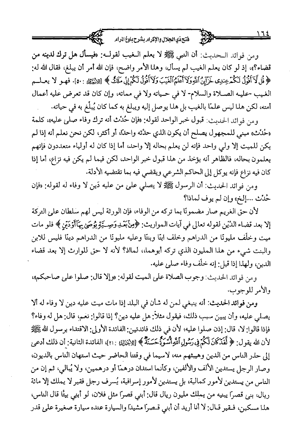 ومن فوائد الحديث: قبول خبر الواحد لقوله: «فإن حدث أنه ترك وفاء صلى عليه» كلمة «حدث» مبني للمجهول يصلح أن يكون الذي حدثه واحداً، أو أكثر، لكن نحن نعلم أنه إذا لم يكن للميت إلا ولي واحد فإنه لن يعلم بحاله إلا واحد، أما إذا كان له أولياء متعددون فإنهم يعلمون بحاله، فالظاهر أنه يؤخذ من هذا قبول خبر الواحد، لكن فيما لم يكن فيه نزاع، أما إذا كان فيه نزاع فإنه يوكل إلى الحاكم الشرعي ويقضي فيه بما تقتضيه الأدلة.