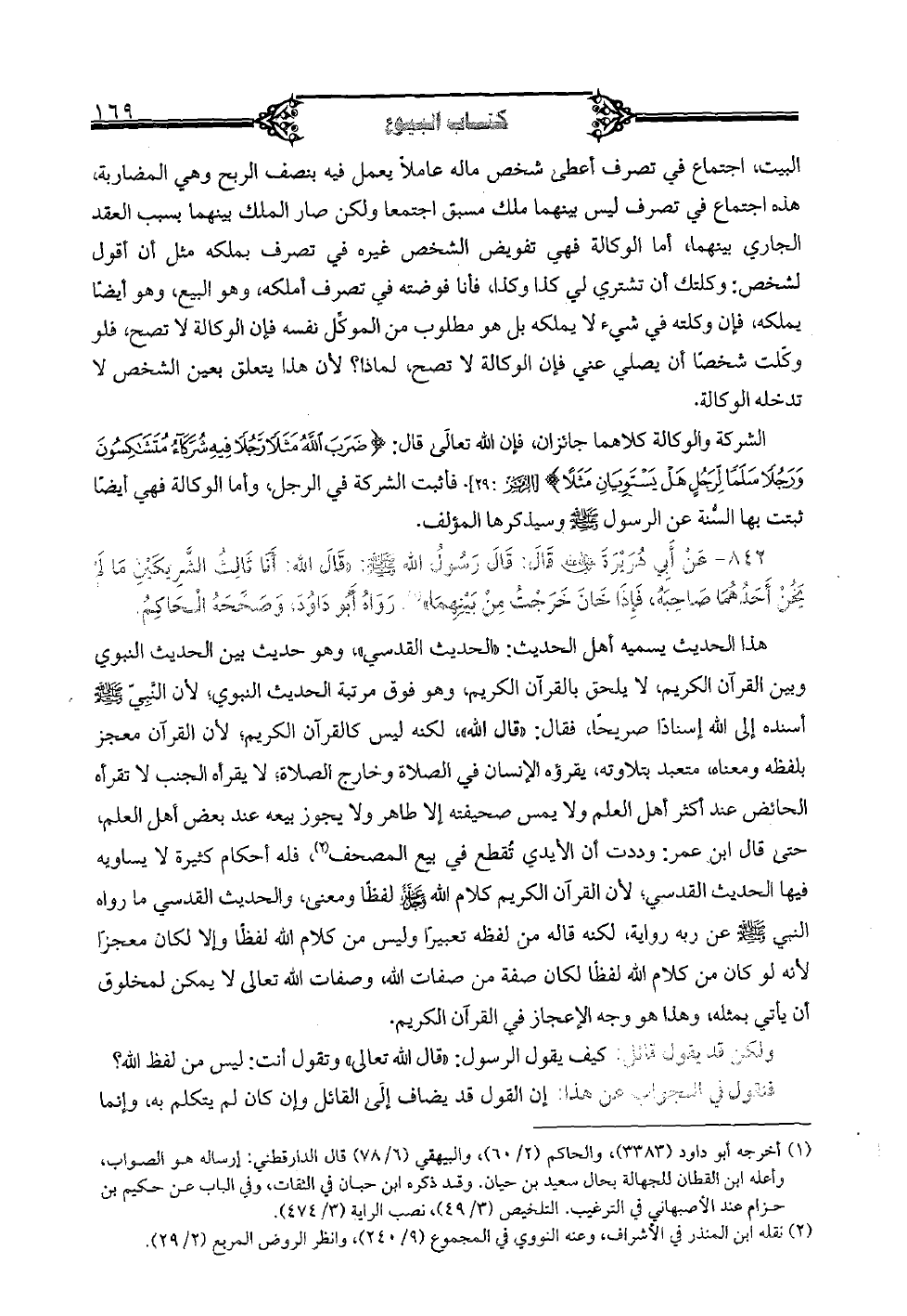 الشركة والوكالة كلاهما جائزان فأن الله تعالى قال: {ضر الله مثلا رجلا فيه شركاء متشاكسون ورجلا سلما لرجل هل يستويان مثلا} [الزمر: 29] فأثبت الشركة في الرجل، وأما الوكالة فهي أيضا ثبتت بها السنة عن الرسول صلى الله عليه وسلم وسيذكرها المؤلف.