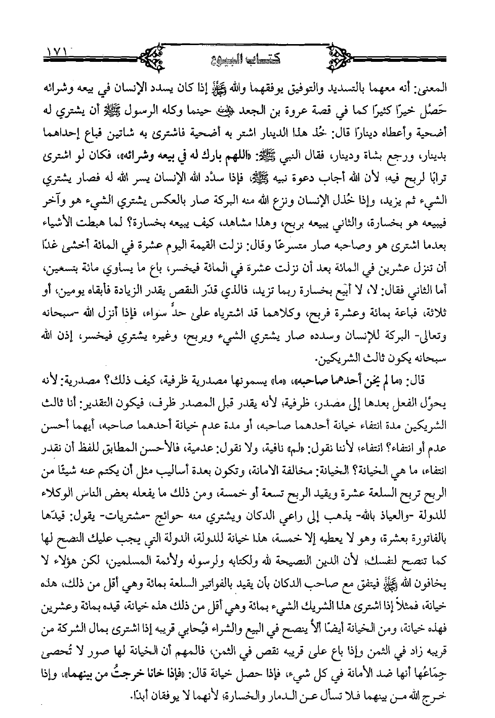 قال: » ما لم يخن أحدهما صاحبه «، » ما «يسمونها مصدرية ظرفية، كيف ذلك؟ مصدرية: لأنه يحول الفعل بعدها إلى مصدر، ظرفية؛ لأنه يقدر قبل المصدر ظرف، فيكون التقدير: أنا ثالث الشريكين مدة انتقاء خيانة أحدهما صاحبه، أو مدة عام خيانة أحدهما صاحبه، أيهما أحسن عدم أو انتفاء؟ انتفاء؛ لأننا نقول: » لم «نافية، ولا نقول: عدمية، فالأحسن المطابق للفظ أن نقدر انتفاء، ما هي الخيانة؟ الخيانة: مخالفة الأمانة، وتكون بعدة أساليب مثل أن يكتم عنه شيئًا من الربح تربح السلعة عشرة ويقيد الربح تسعة أو خمسة، ومن ذلك ما يفعله بعض الناس الوكلاء للدولة- والعياذ بالله-يذهب إلى راعي الدكان ويشتري منه حوائج- مشتريات-يقول: قيدها بالفاتورة عشرة، وهو لا يعطيه إلا خمسة، هذا خيانة للدولة، الدولة التي يجب عليك النصح لها كما تنصح لنفسك؛ لأن الدين النصيحة لله ولكتابه ولرسوله ولأئمة المسلمين، لكن هؤلاء لا يخافون الله عز وجل فيتفق مع صاحب الدكان بأن يقيد بالفواتير السلعة بمائة وهي أقل من ذلك، هذه خيانة، فمثلًا إذا اشترى هذا الشريك الشيء بمائة وهي أقل من ذلك هذه خيانة، قيده بمائة وعشرين فهذه خيانة، ومن الخيانة أيضًا ألا ينصح في البيع والشراء فُيحابي قريبه إذا اشترى بمال الشركة من قريبه زاد في الثمن وإذا باع على قريبه نقص في الثمن، فالمهم أن الخيانة لها صور لا تُحصى جِمَاعُها أنها ضد الأمانة في كل شيء، فإذا حصل خيانة قال: » فإذا خانا خرجتُ من بينهما «، وإذا خرج الله من بينهما فلا تسأل عن الدمار والخسارة؛ لأنهما لا يوفقان أبدًا. «»