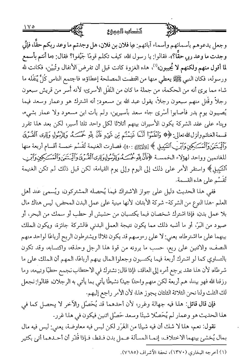 وجعل يدعوهم بأسمائهم وأسماء آبائهم: » فلان بن فلان «، هل وجدتم ما وعد ربكم حقًًا، فإني وجدت ما وعد ربي حقًا؟ . فقالوا: يا رسول الله كيف تكلم قومًا جيفوا؟ فقال: » ما أنتم أسمع لما أقول منهم ولكنهم لا يجيبون «، وههذه الغزوة كانت قبل أن تفرض الأنفال وتُبين، فكانت لله ورسوله، فكان النبي صلى الله عليه وسلم يعطي منها من اقتضت المصلحة إعطاؤه، فاجتمع الناس كل ينفله ما شاء مما يرى أنه من الحكمة، من جملة ما كان من النفل الأسري، لأنه أسر من قريش سبعون رجلًا وقُتل منهم سبعون رجلًا، يقول عبد الله بن مسعود: أنه اشترك هو وعمار وسعد فيما يصيبون يوم بدر فأصابوا أسرى جاء سعد بأسيرين، ولم يأت ابن مسعود ولا عمار بشيء، وبناء على عقد الشركة يكون الأسيران بينهم أثلاثًا لكل واحد ثلثا أسير، لكن بعد هذا تقرر قسمة الغنائم وأنزل الله تعالى {واعلموا أنما غنمتم من شيء فإن لله خمسه وللرسول ولذي القربى واليتامى والمساكين وابن السبيل} [الأنفال: 40]. فصارت الغنيمة تُقسم خمسة أقسام أربعة منها للغانمين وواحد لهؤلاء الخمسة {فإن لله خمسه وللرسول ولذي القربى واليتامى والمساكين وابن السبيل} واستقر الأمر على ذلك إلى اليوم وإلى يوم القيامة، لكن قبل ذلك لم تكن الغنيمة تُقسم على هذه القسمة.