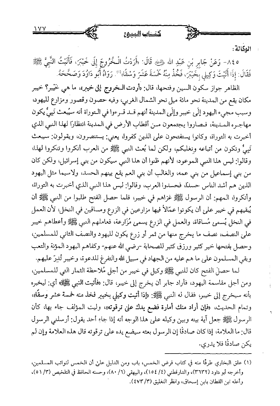 لما حصل الفتح كان النبي صلى الله عليه وسلم وكيل في خيبر من أجل ملاحظة الثمار التي للمسلمين ومن أجل مقاسمة اليهود، فأراد جابر أن يخرج إلى خيبر، قال: «فأتيت النبي صلى الله عليه وسلم» أي: ليخبره بأنه سيخرج إلى خيبر، فقال له النبي صلى الله عليه وسلم «إذا أتيت وكيلي بخيبر فخذ منه خمسة عشر وسقا» وتمام الحديث، «فإن أراد منك أمارة فضع يدك على ترقوته» وليت المؤلف جاء بها، كأن الرسول صلى الله عليه وسلم جعل آية بينه وبين وكيله على هذا الوجه أنه إذا جاء أحد يقول: أرسلني الرسول قال: ما العلامة إذا كان صادقاً أن الرسول بعثه سيضع يده على ترقوته قال هذه العلامة وإن لم يكن صادقاً فلا يدري.