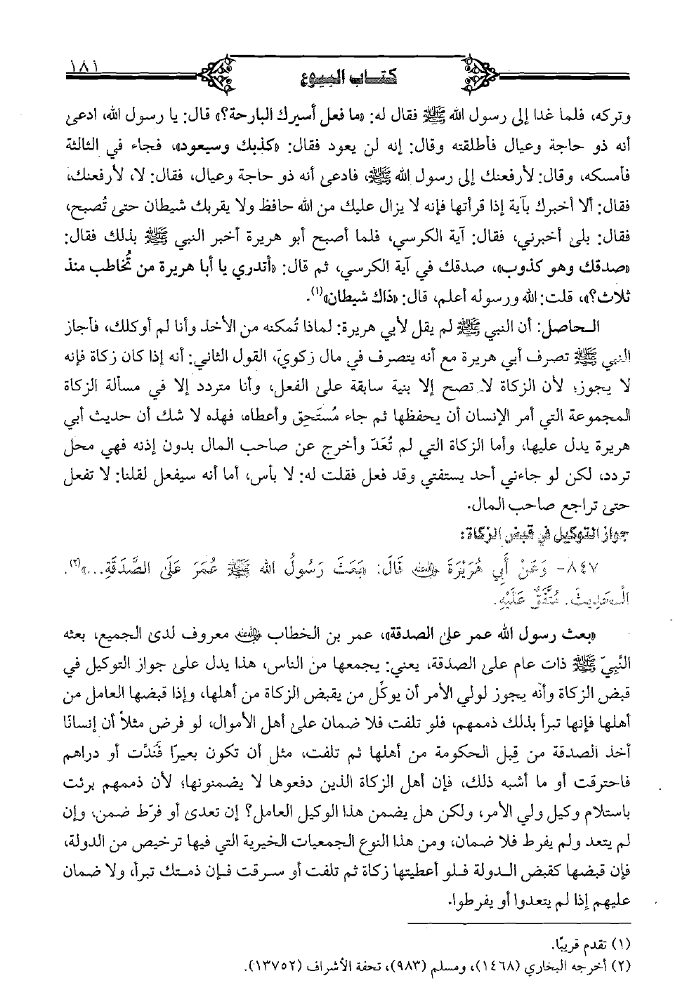 الحاصل/ أن النبي صلى الله عليه وسلم لم يقل لأبي هريرة: لماذا تمكنه من الأخذ وأنا لم أوكلك، فأجاز النبي صلى الله عليه وسلم تصرف أبي هريرة مع أنه يتصرف في مال زكوي، القول الثاني: أنه إذا كان زكاة فإنه لا يجوز، لأن الزكاة لا تصح إلا بنية سابقة على الفعل، وأنا متردد إلا في مسألة الزكاة المجموعة التي أمر الإنسان أن يحفظها ثم جاء مستحق وأعطاه، فهذه لا شك أن حديث أبي هريرة يدل عليها، وأما الزكاة التي لم تعد وأخرج عن صاحب المال بدون إذنه فهي محل تردد، لكن لو جاءني أحد يستفتي وقد فعل فقلت له: لا بأس، أما أنه سيفعل لقلنا: لا تفعل حتى تراجع صاحب المال.