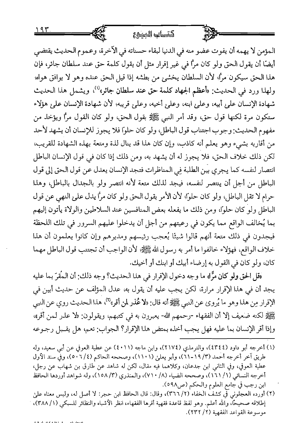 «قل الحق ولو كان مرًا» ما وجه دخول الإقرار في هذا الحديث؟ وجه ذلك: أن المُقرّ بما عليه يجد أن في هذا الإقرار مرارة، لكن يجب عليه أن يقول به، عدل المؤلف عن حديث الإقرار من هذا وهو ما يُروى عن النبي صلى الله عليه وسلم أنه قال: «لا عُذر لمن أقر» هذا الحديث روي عن النبي صلى الله عليه وسلم لكنه ضعيف إلا أن الفقهاء -رحمهم الله- يعبرون به في كتبهم، ويقولون: «لا عذر لمن أقر»، وإذا أقر الإنسان بما عليه فهل يجب أخذه بمتض هذا الإقرار؟ الجواب: نعم، هل يقبل رجوعه