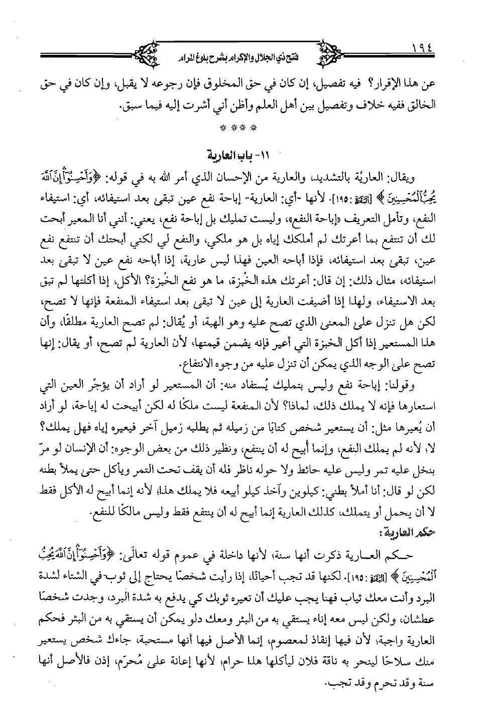 ويقال: العارية بالتشديد، والعارية من الإحسان الذي أمر الله به في قوله: {وأحسنوا إن الله يحب المحسنين} [البقرة: 195]. لأنها -أي العارية- إباحة نفع عين تبقى بعد استيفاءه، أي: استيفاء النفع وتأمل التعريف «إباحة النفع»، وليست تمليك بل إباحة نفع، يعني: أنني أنا المعير أبحت لك أن تنتفع بما أعرتك لم أملكك إياه بل هو ملكي، والنفع لي لكني أبحتك أن تنفع نفع عين، تبقى بعد استيفائه، فإذا أباحة العين فهذا ليس عاري، إذا أباحه نفع عين لا تبقى بعد استيفائه، مثال لك: إن قال: أعرتك هذه الخُبزة، ما هو نفع الخُبزة؟ الأكل، إذا أكلتها لم تبق بعد الاستيفاء، ولهذا إذا أضيفت العارية إلى عين لا تبقى بعد استيفاء المنفعة فإنها لا تصح، لكن هل تنزل على المعنى الذي تصح عليه وهو الهبة، أو يُقال: لم تصح العارية مُطلقًا، وأن هذا المستعير إذا أكل الخبزة الني أعير فإنه يضمن قيمتها؛ لأن العارية لم تصح، أو يقال: إنها تصح على الوجه الذي يمكن أن تنزل عليه من وجوه الانتفاع.